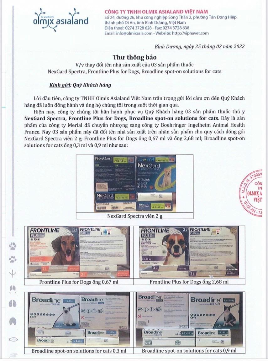 Sản phẩm của công ty Merial (Pháp), nay đã được chuyển sang công ty Boehringer. (Vui lòng tham khảo thông báo về việc đổi tên nhà sản xuất và đổi mẫu bao bì trong phần hình ảnh sản phẩm).
