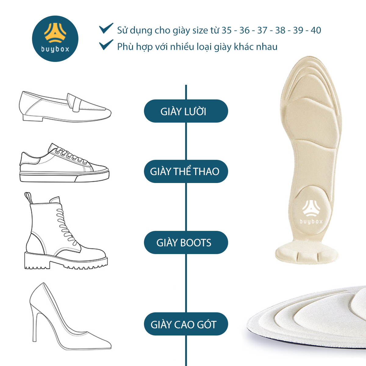 - Đặt lót đa năng vào giày, tháo giấy có keo phía sau để định phần lót gót cố định vào giày Lưu ý: Sản phẩm mang thương hiệu buybox có bao bì in logo và hướng dẫn sử dụng chi tiết đi kèm.