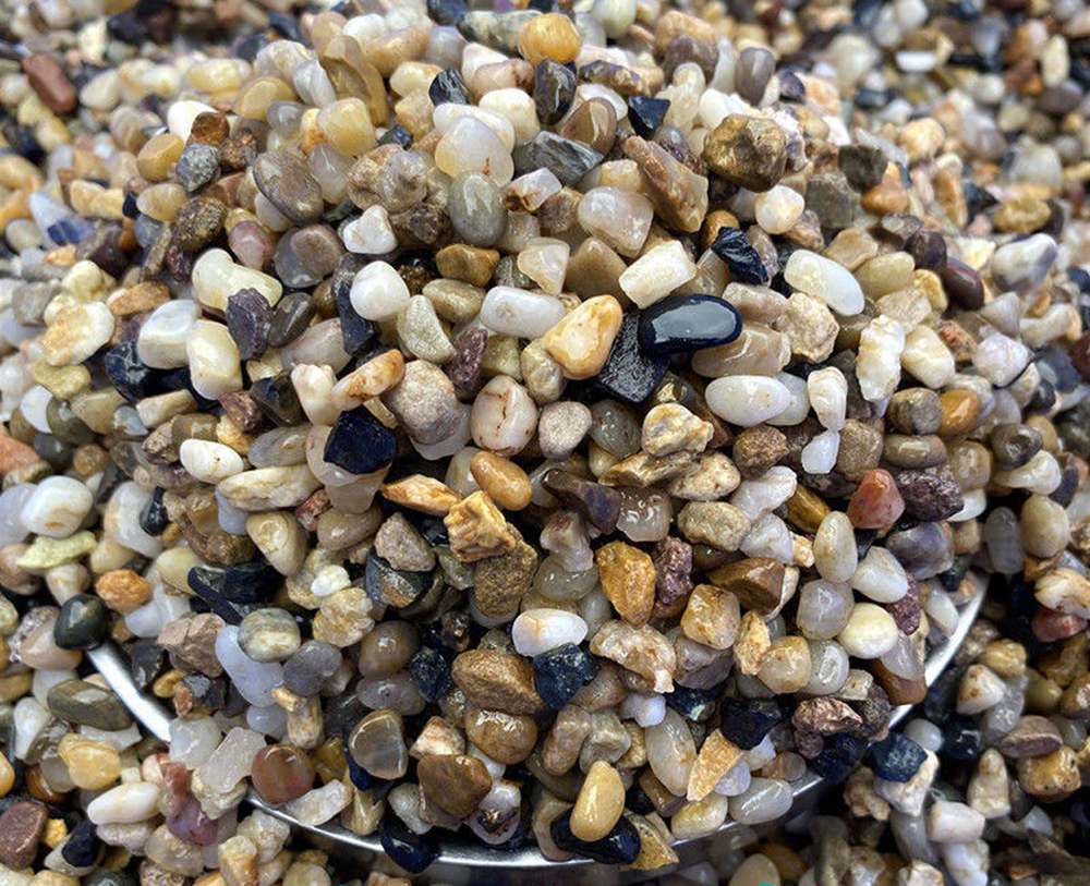 Sạn suối tự nhiên có màu sắc đa màu sách, có hình chữ nhật, hình tam giác. Kích thước trung bình bằng đuôi bút. Sỏi không bị phai màu, cũng như không bị tan ra khi vào nước.