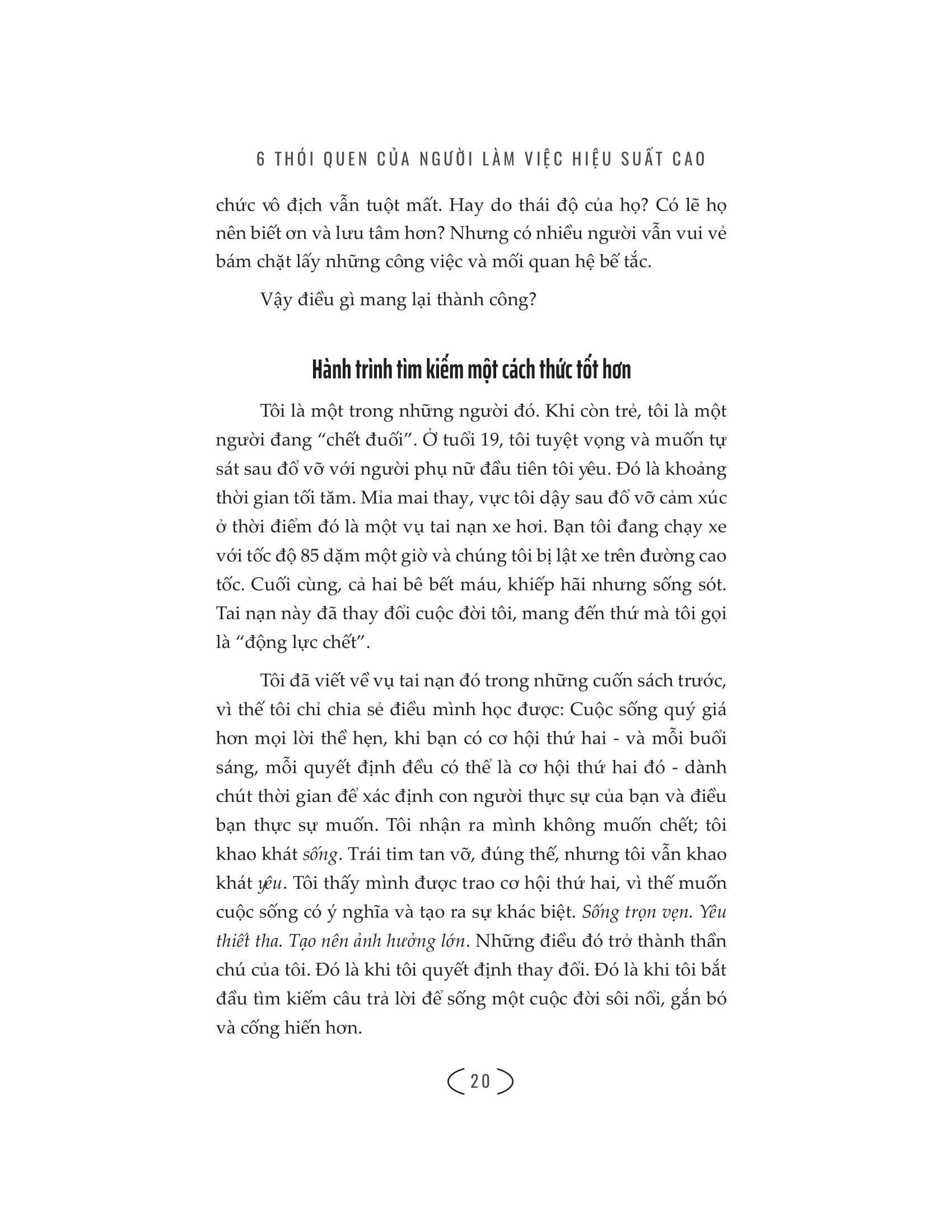 Mua tại TiktokTất cả chúng ta đều muốn có hiệu suất cao trong mọi lĩnh vực cuộc sống, từ học tập, làm việc, đến mở rộng mối quan hệ hay xử lý các vấn đề cá nhân. Nhưng ta phải làm những gì, phải hình thành những thói quen nào để đạt được thành công lâu dài và hạnh phúc bất kể tuổi tác, nghề nghiệp, ưu điểm hay tính cách của ta? Brendon Burchard – một trong những nhà huấn luyện uy tín nhất thế giới hiện nay về vấn đề phát triển bản thân đã chỉ ra 6 thói quen cần có để tối ưu hiệu suất làm việc. Đó là: