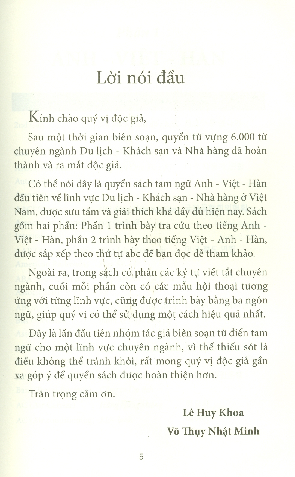 Mua tại TiktokSau một thời gian biên soạn, quyển "6000 từ vựng chuyên ngành Du lịch - Khách sạn - Nhà hàng Anh - Việt - Hàn" đã hoàn thành và ra mắt độc giả. Có thể nói đây là quyển sách tam ngữ Anh - Việt - Hàn đầu tiên về lĩnh vực Du lịch - Khách sạn - Nhà hàng ở Việt Nam, được sưu tầm và giải thích khá đầy đủ hiện nay. Sách gồm hai phần: Phần 1 trình bày tra cứu theo tiếng Anh - Việt - Hàn. Phần 2 trình bày theo tiếng Việt - Anh - Hàn, được sắp xếp theo thứ tự abc để bạn đọc dễ tham khảo.