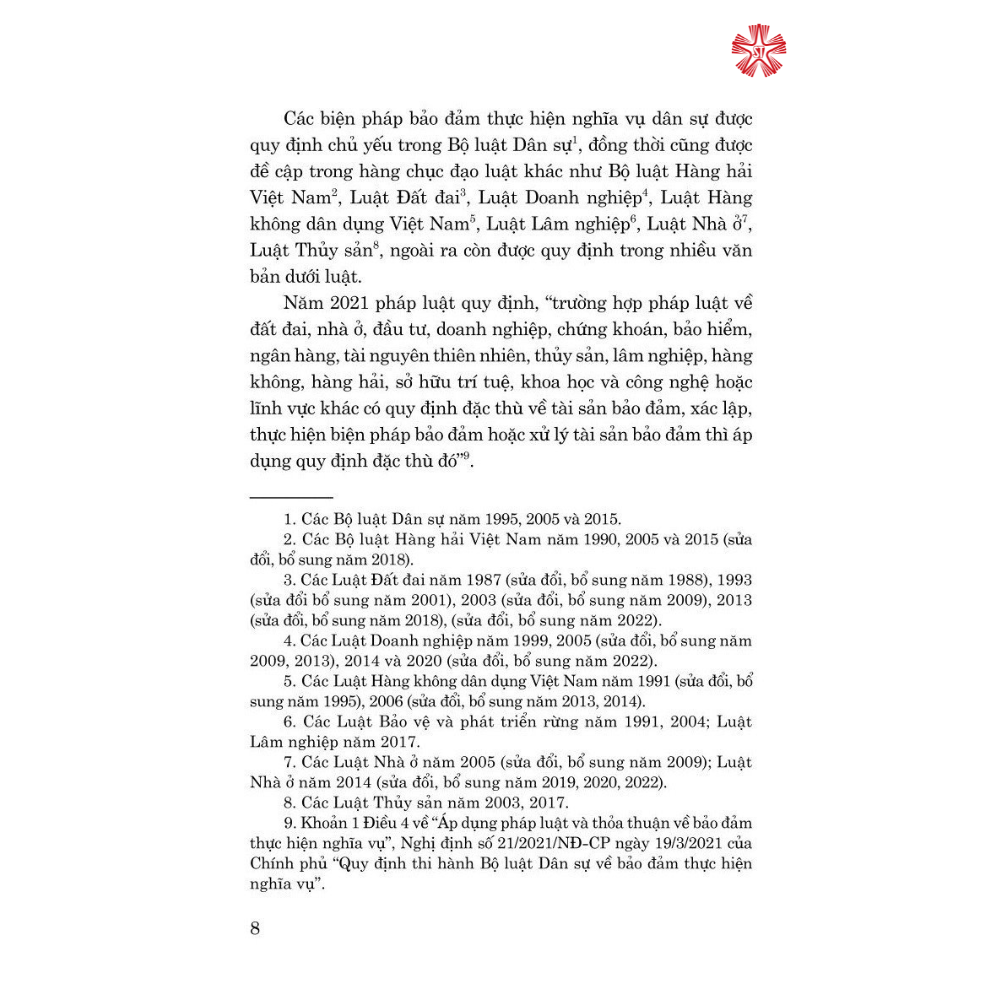 Với mục đích cung cấp cho bạn đọc những thông tin cơ bản về các biện pháp bảo đảm theo quy định của Bộ luật Dân sự năm 2015, Nghị định số 21/2021/NĐ-CP ngày 19/3/2021 quy định thi hành Bộ luật Dân sự về bảo đảm thực hiện nghĩa vụ, Nhà xuất bản Chính trị quốc gia Sự thật tái bản có sửa chữa, bổ sung cuốn sách: 9 biện pháp bảo đảm nghĩa vụ hợp đồng (Quy định, thực tế và thiết kế giao dịch theo Bộ luật Dân sự hiện hành) do Luật sư Trương Thanh Đức, Giám đốc Công ty Luật ANVI, Trọng tài viên Trung tâm trọng tài quốc tế Việt Nam (VIAC), thành viên Nhóm chuyên gia tư vấn xây dựng và thành viên Hội đồng thẩm định Dự án Bộ luật Dân sự biên soạn. Tác giả đã có hơn 30 năm nghiên cứu, trải nghiệm thực tiễn và hơn 40 bài viết chuyên sâu về giao dịch bảo đảm, đặc biệt là bảo đảm tiền vay của các ngân hàng thương mại. Trong cuốn sách này, tác giả đã phân tích, luận giải các biện pháp bảo đảm cả về quy định pháp lý và khả năng áp dụng trên thực tiễn, đồng thời gợi mở cách thức thực hiện cho các chủ thể tham gia giao dịch này.