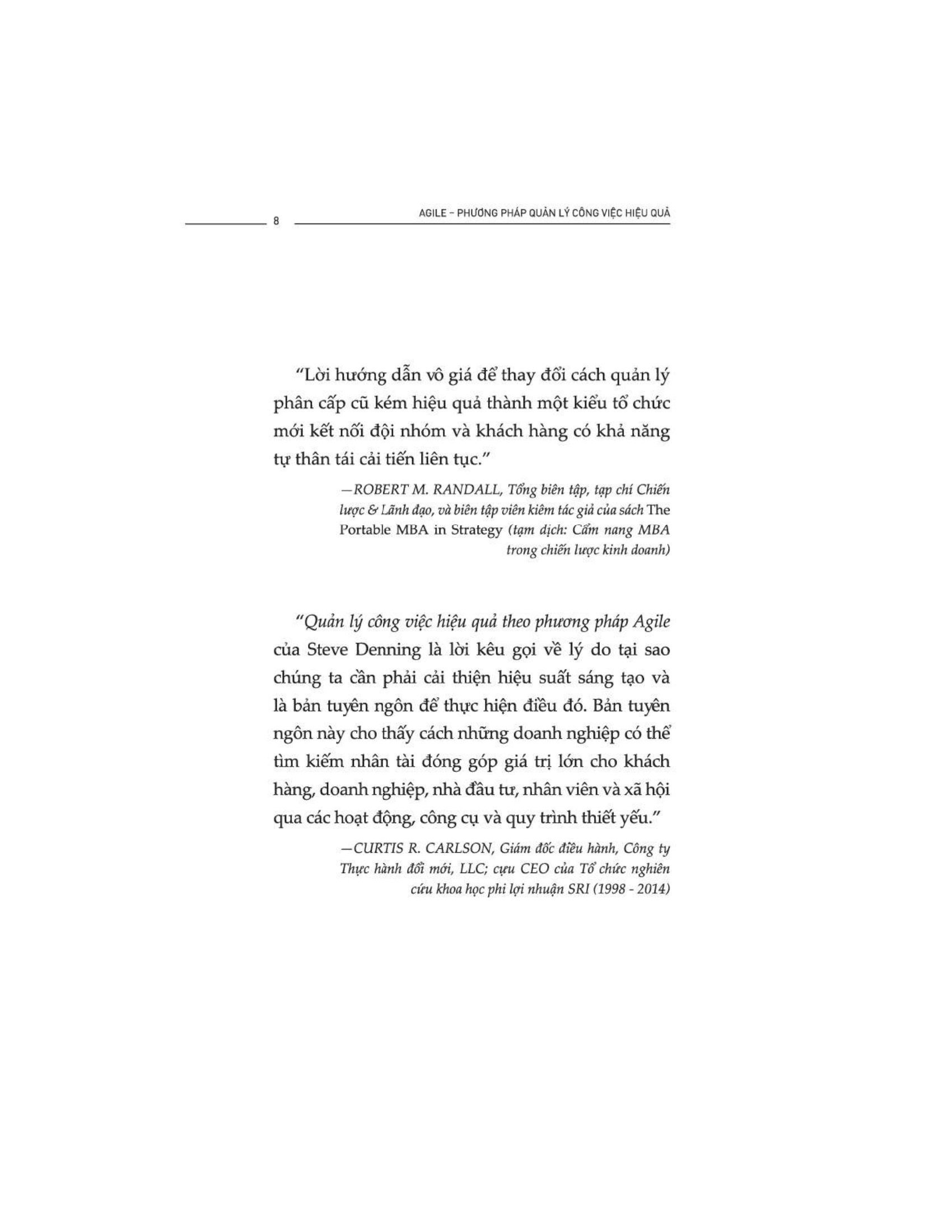 Với các công thức đột phá, mô hình Agile cho phép đội nhóm, đơn vị hoặc doanh nghiệp nhanh chóng tích lũy và nâng cấp các sản phẩm và dịch vụ để đáp ứng nhu cầu thay đổi liên tục, thậm chí ngay cả những tổ chức “khổng lồ toàn cầu” cũng có thể học cách tổ chức tinh gọn và hành động linh hoạt trong kinh doanh.