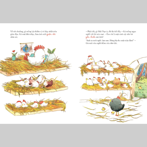 Ở chuồng gà, ngày nào chú gà trống cũng diễu qua diễu lại chế nhạo các cô gà mái và chỉ để lại cho chúng ít vụn thức ăn. Các cô gà mái đã chán ngấy cảnh này, chỉ biết thở dài và bịt tai lại.