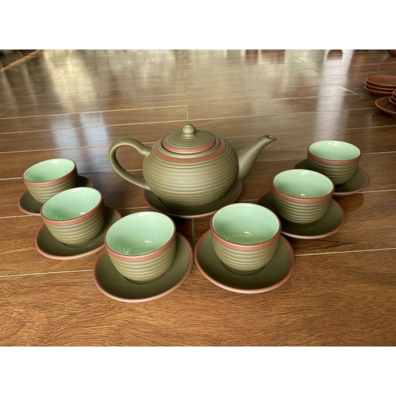 Ấm chén men xanh rêu đậm khắc hoạ tiết sen Gốm sứ Bát Tràng Bọc đồng cao cấp ĐẸP sang trọng và cuốn hút 1 ấm 6 chén 7 đĩa kê giá 1000k Phụ kiện