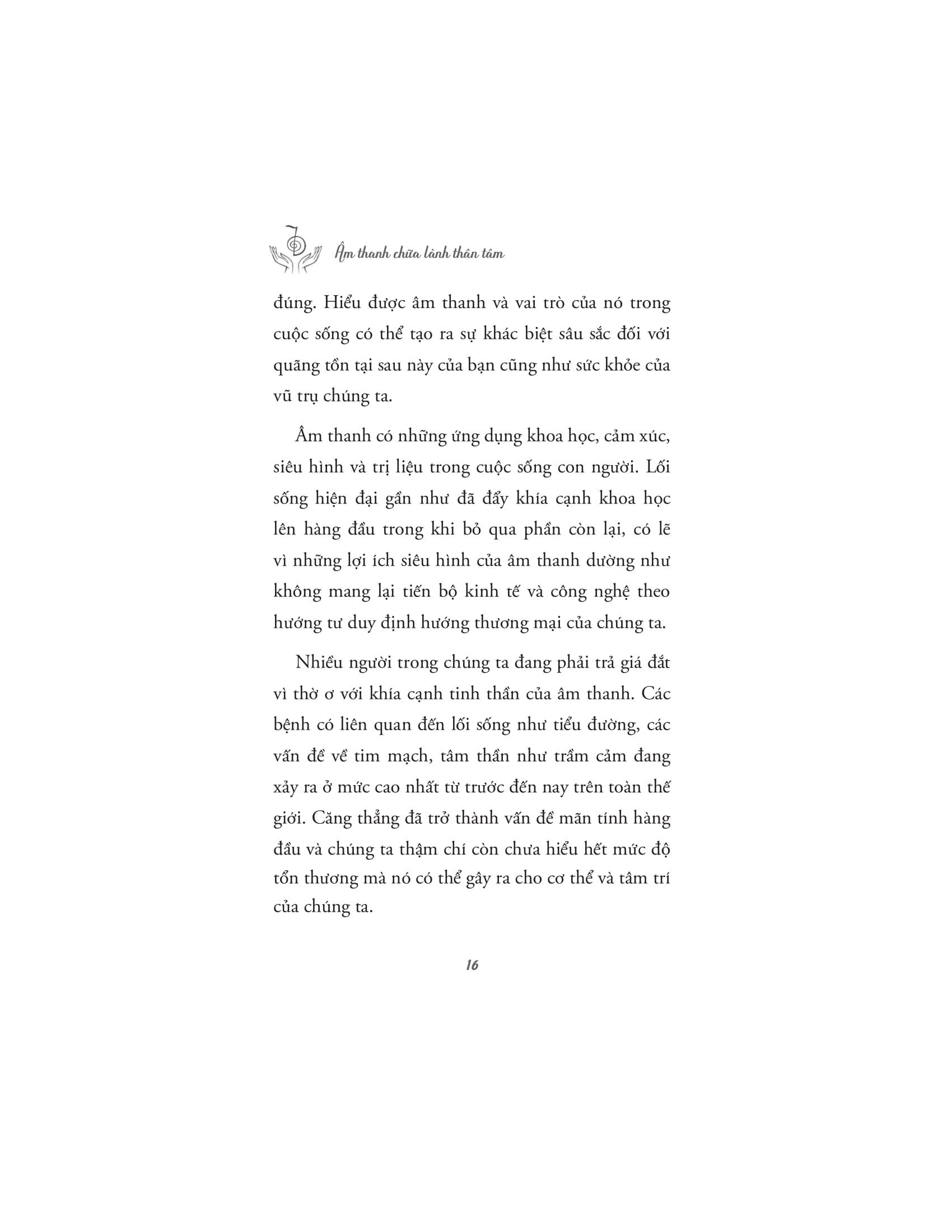 Âm Thanh Chữa Lành Thân Tâm Với nhịp sống hối hả hiện nay, mức độ căng thẳng ngày càng tăng khiến cơ thể và tâm trí bạn mệt mỏi. Âm nhạc và phương pháp trị liệu bằng âm thanh trở thành một trong số những phương pháp then chốt trong việc đ.iều trị tâm lý. Một trong những tác động đáng chú ý nhất của âm thanh và âm nhạc là khả năng ảnh hưởng đến tâm trạng. Một số âm thanh hoặc bản nhạc có thể khơi gợi những cảm xúc cụ thể như hạnh phúc, nỗi buồn hoặc nỗi nhớ. Ví dụ, nghe nhạc sôi động và lạc quan có thể tăng mức năng lượng, nâng cao cảm xúc tích cực và thúc đẩy cảm giác vui vẻ, nhiệt tình. Ngược lại, những giai điệu nhẹ nhàng, du dương có thể tạo bầu không khí yên tĩnh giúp chúng ta thư giãn, giảm căng thẳng. Cuốn sách "Âm Thanh Chữa Lành Thân Tâm" sẽ giúp bạn khai mở về sức mạnh của âm thanh trong việc chữa lành cả cơ thể lẫn tâm hồn. Cuốn sách tập trung vào việc giải thích cách mà âm thanh và các rung động có thể ảnh hưởng đến trạng thái năng lượng của con người, giúp xoa dịu căng thẳng, tái tạo năng lượng và kích hoạt các quá trình chữa lành tự nhiên từ bên trong. Tác giả dẫn dắt người đọc qua những ứng dụng khoa học, tâm linh và siêu hình của âm thanh, giải thích cách mà các liệu pháp âm thanh cổ xưa đã được sử dụng trong nhiều nền văn hóa khác nhau để chữa lành và cải thiện sức khỏe. Âm thanh không chỉ có khả năng tác động đến cảm xúc, mà còn có thể ảnh hưởng tích cực đến hệ thần kinh, hệ miễn dịch, và thậm chí là các luân xa, trung tâm năng lượng trong cơ thể con người. Với nhiều kỹ thuật và phương pháp trị liệu âm thanh khác nhau, những liệu pháp này giúp cơ thể thư giãn, giảm căng thẳng, loại bỏ tắc nghẽn năng lượng và khôi phục lại trạng thái cân bằng tự nhiên. Một trong những thông điệp quan trọng của cuốn sách là sự kết nối sâu sắc giữa con người và vũ trụ thông qua âm thanh. Các rung động âm thanh không chỉ giúp giải phóng những cảm xúc bị kìm nén, mà còn mở ra những con đường năng lượng, giúp con người tiếp cận những tần số cao hơn, mang lại sự bình an và nhận thức sâu sắc về sự hiện diện và vai trò của m.ình trong vũ trụ. "Âm thanh chữa lành thân tâm" là một cuốn sách không chỉ dành cho những người muốn tìm hiểu về âm nhạc và trị liệu, mà còn cho bất kỳ ai mong muốn khám phá sự kết nối giữa thân, tâm và vũ trụ thông qua các rung động của âm thanh. Về Tác giả: Ascending Vibrations là một nhóm xuất bản độc lập dành riêng cho những ai muốn mở rộng ý thức và nâng cao sự tồn tại của họ. Họ muốn mang đến sự gia tăng nhận thức có ý thức trong thế giới hiện đại với các tác phẩm sâu sắc và dễ hiểu về các yếu tố tâm linh cốt lõi như chánh niệm, tăng cường luân xa, bí mật chữa bệnh bằng âm thanh, kiến thức cổ xưa, kỹ thuật yoga, v.v.