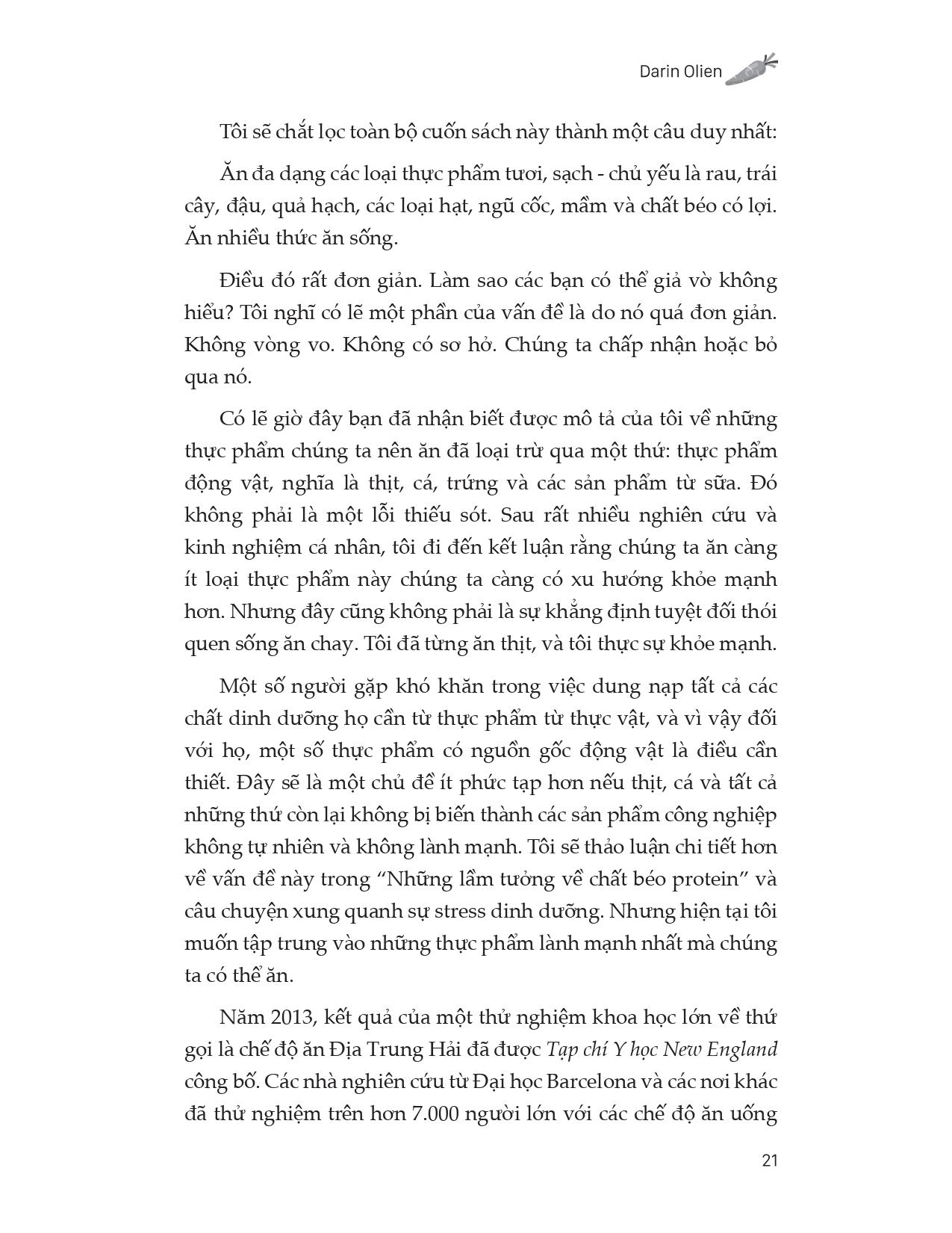 Trong Ăn sạch sống xanh, tâm lành trí khỏe, Darin Olien cung cấp cho chúng ta một cách suy nghĩ hoàn toàn mới về sức khỏe và hạnh phúc bằng cách xác định các động lực sống: Dinh dưỡng chất lượng, Hydrat hóa, Giải độc, Oxy hóa và Kiềm hóa, cho chúng ta biết cách duy trì cân nặng hợp lý, ngăn ngừa ngay cả những căn bệnh nghiêm trọng nhất. Chúng ta luôn được dạy phải xem máu, xương, da, các cơ quan, các nơ-ron thần kinh và tất cả mọi thứ khác một cách riêng rẽ và mỗi bộ phận lại mang đến những vấn đề hay mối lo ngại không giống nhau. Nhưng sự thật là, mỗi một bộ phận nhỏ nhất bên trong cơ thể người, mọi phân tử và tế bào đều phản ứng với năm sinh lực của cuộc sống kể trên. Việc ta cần làm chỉ là làm sao nắm bắt những yêu cầu đó - năm sinh lực của cuộc sống. Và sau đó, ta phải cố gắng hết sức để hoàn thành.