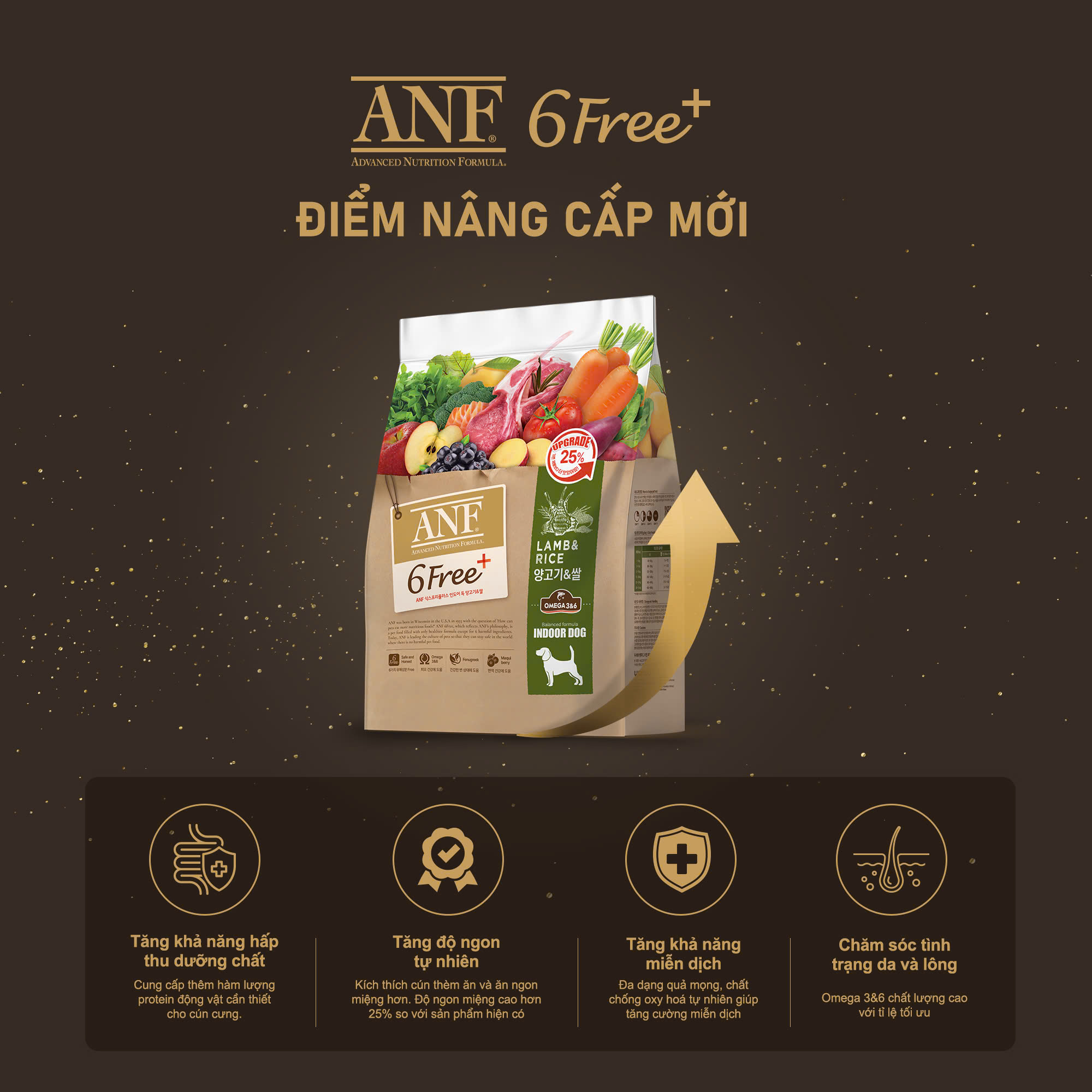 * 5 điểm vàng làm nên sự khác biệt của ANF 6FREE+: - THƠM NGON GẤP ĐÔI: Tăng cường protein từ nguyên liệu thịt động vật với nhiều hương vị mới thượng hạng hơn, ngon