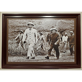 Ảnh gốc Chủ tịch HỒ CHÍ MINH và Đại tướng VÕ NGUYÊN GIÁP thăm đơn vị bộ đội diễn tập 1957 -ID178 Chất liệu tranh in dầu trên lụa cao cấp được phủ lớp pe