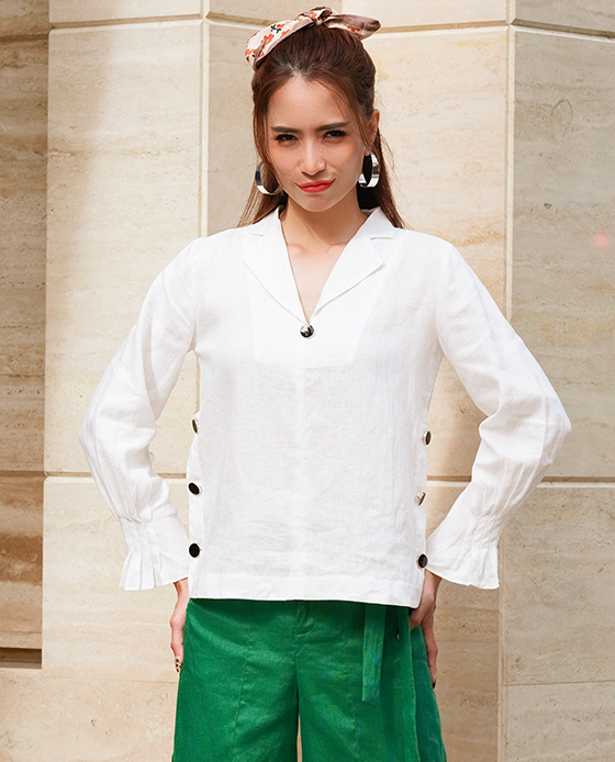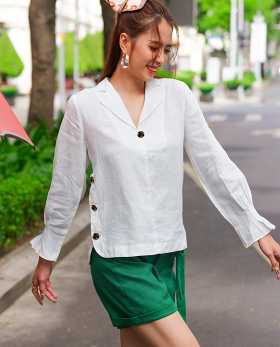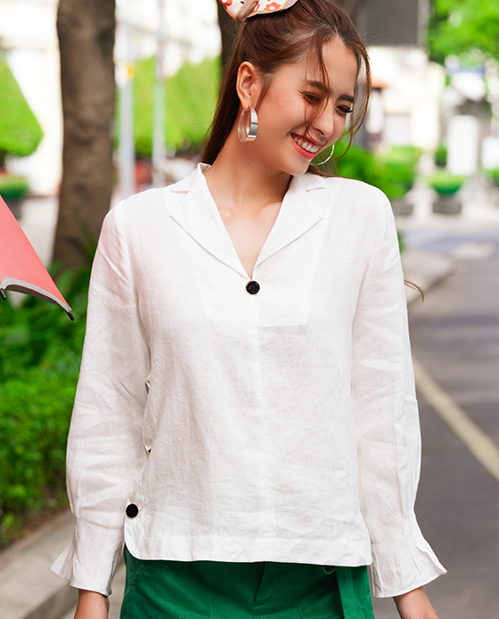 Áo Cổ Ve Linen Vinca TOP148 Thời trang thiết kế HityKiểu dáng áo suôngCổ ve, điểm 1 nút tròn đen viền vàng ánh kimTay dài, cổ tay xếp ly cách điệuMở 2 bên hông, nhấn bằng hai hàng nút tròn đen vi...
