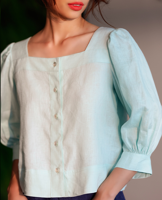 Áo Croptop Linen Aqua TOP132 Thời trang thiết kế HityKiểu dáng áo suông rộng ngắn ngang lưng quần croptopCổ vuôngTay phồng nhún vaiCài bằng hàng nút phía trướcCHẤT LIỆULinenNút vò sò xanh tự n...