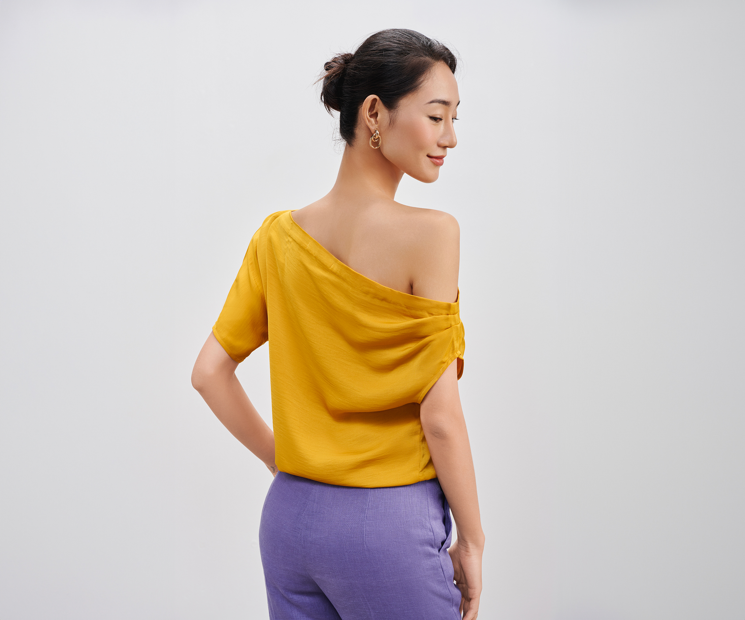 Áo kiểu lệch vai, 1 bên vai xếp ly, 1 bên vai rộng tay liền