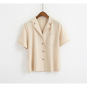 Áo sơ mi cổ sen tay ngắn xinh xắn Mô tả Size S: sản phẩm vòng eo rộng 64cm - 66cm, vòng ngực rộng 84cm-86cm, vòng mông rộng 86cm-88cm Size M: sản phẩm vòng eo