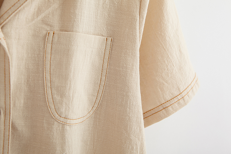 Áo sơ mi cổ bẻ, có nút nhựa ở giữa, tay ngắn, áo 1 lớp, có túi