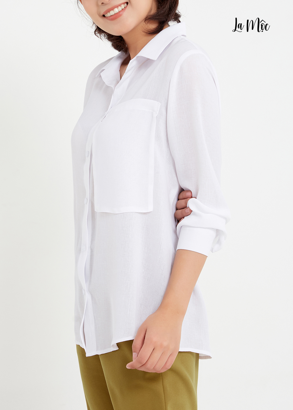 Áo sơ mi, áo công sở LA MỘC, áo sơ mi trắng, tay dài, có túi, chất liệu cotton, hàng thiết kế "- Sơ mi trắng phối túi tạo điểm nhấn với thiết kế cơ