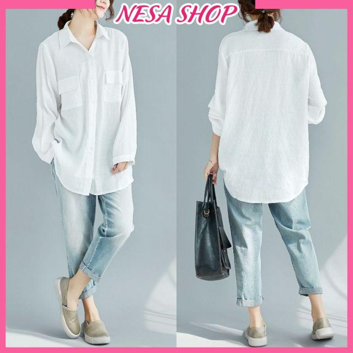1.Tên sản phẩm: Áo sơ mi nữ trắng dài tay, áo form rộng, chất liệu Đũi tơ mềm mịn, sơ mi nữ đẹp phong cách Hàn Quốc NeSa Shop.