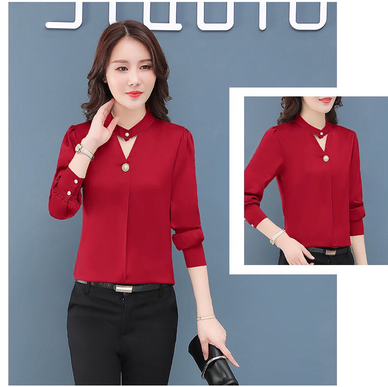 Kiểu dáng: áo sơ mi công sở cổ tim thanh lịch, phối nút duyên dáng, tay dài cài nút phong cách phù hợp công sở, công tác, đi dạy, đi học, đi tiệc Chất liệu: