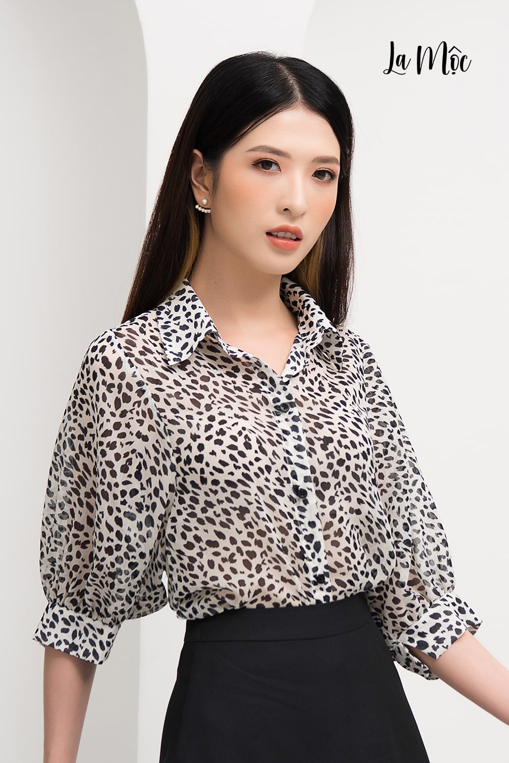 Áo sơ mi La Mộc họa tiết da beo thể hiện được nữ quyền. Thiết kế tay lỡ phồng và nhún nhẹ mang đến cảm giác thanh lịch cho nàng. Thiết kế với sự chỉnh
