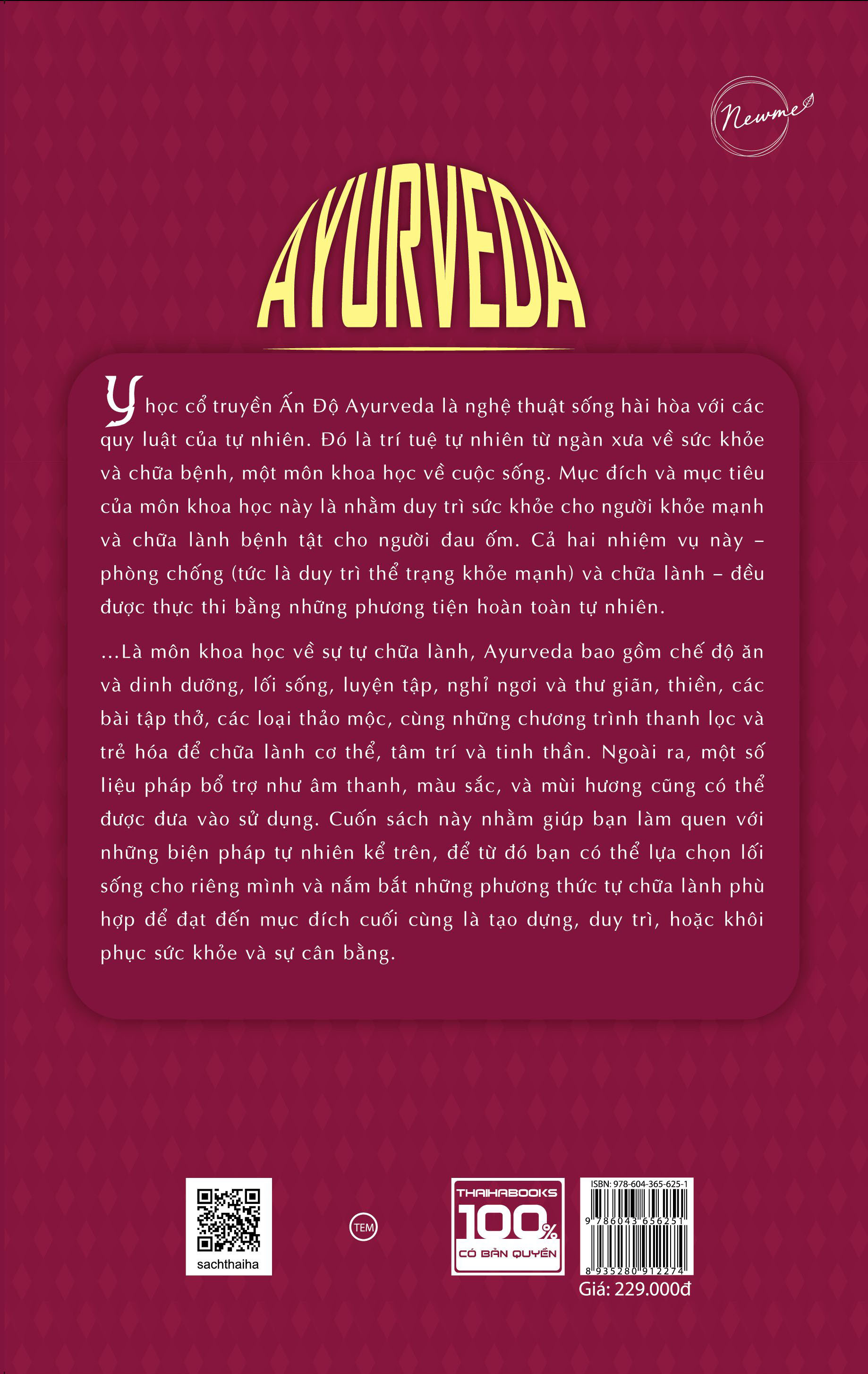 Là môn khoa học về sự tự chữa lành, Ayurveda bao gồm chế độ ăn và dinh dưỡng, lối sống, việc luyện tập, nghỉ ngơi và thư giãn, thiền định, các bài tập thở, các loại thảo mộc, cùng những chương trình thanh lọc và trẻ hóa để chữa lành cơ thể, tâm trí và tinh thần. Ngoài ra, một số liệu pháp bổ trợ như âm thanh, màu sắc và mùi hương cũng có thể được đưa vào sử dụng. Cuốn sách này nhằm giúp bạn làm quen với những biện pháp tự nhiên kể trên, để từ đó bạn có thể lựa chọn lối sống cho riêng mình và nắm bắt những phương thức tự chữa lành phù hợp nhằm đạt đến mục đích cuối cùng là tạo dựng, duy trì hoặc khôi phục sức khỏe và sự cân bằng.