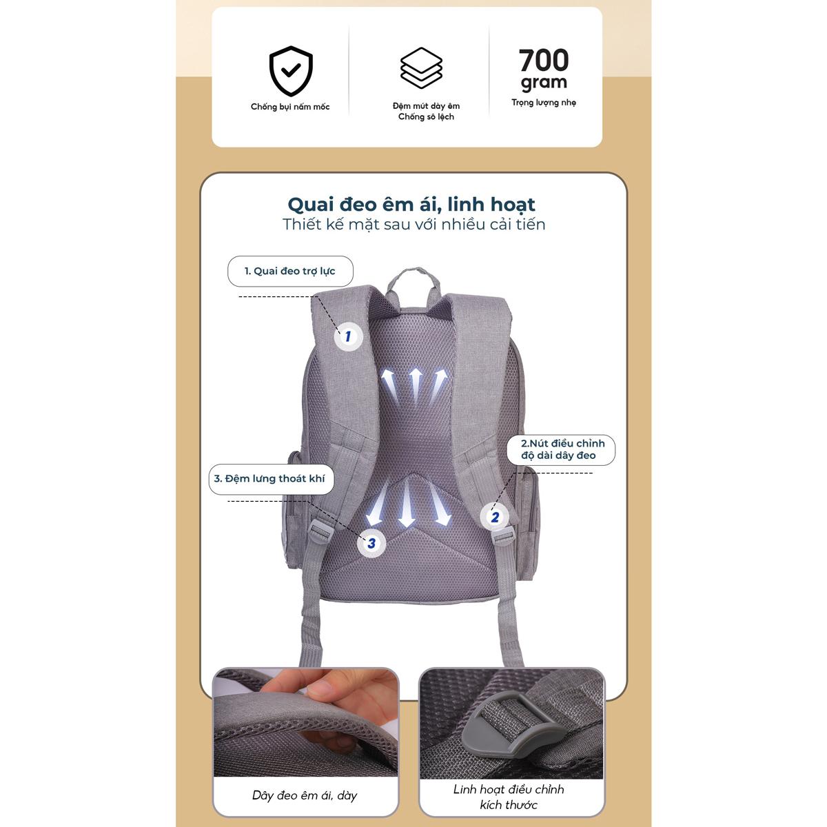 Thông tin sản phẩm: Balo học sinh Cấp 1 siêu nhẹ, chống gù, chống thấm nước, cặp sách học sinh - Chất liệu: Vải polyester chống co giãn, chống nhăn tốt - Sản
