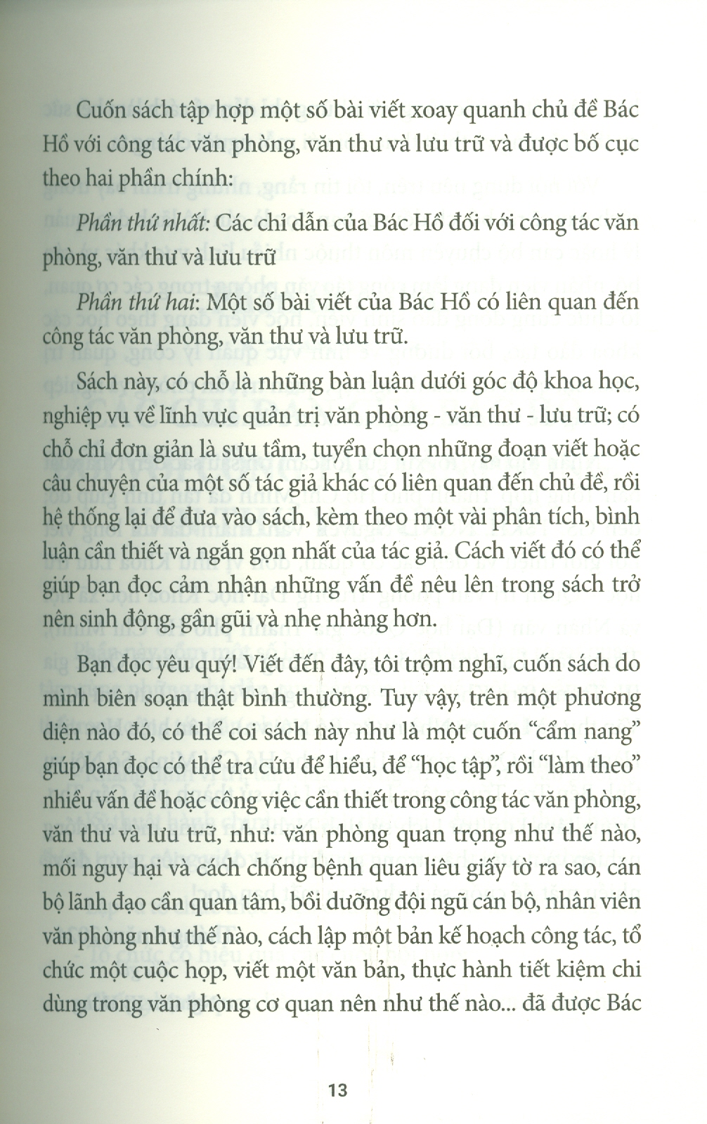 Phần thứ nhất, từ những chỉ dẫn trong nhiều bài viết của Bác Hồ, được tác giả lựa chọn một cách kỹ lưỡng và lần lượt phân tích, làm sáng tỏ những nội dung cơ bản của công tác văn phòng, văn thư, lưu trữ mà những người được phân công làm công việc này trong các cơ quan Đảng, Nhà nước cũng như các doanh nghiệp đều cần nắm vững.