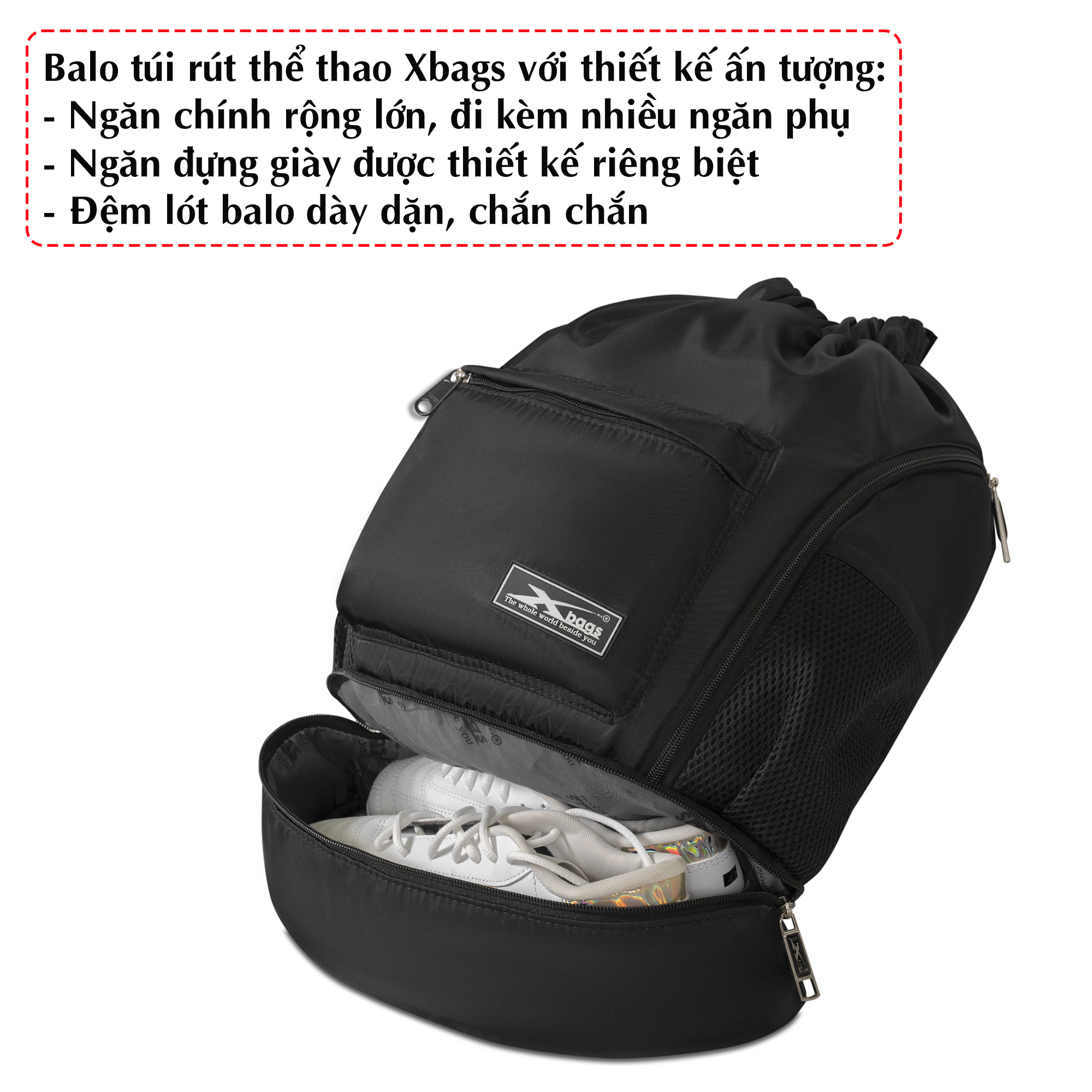 Balo dây rút thể thao chống nước Xbags thích hợp đi tập gym, đá bóng, bóng rổ đa năng Thông tin sản phẩm: Chất liệu : Vải lưới nhập khẩu chống nước, chống bám bụi, chống mài mòn Kích thước : Dài x Rộng x Cao : 34 x 15 x 46 cm Màu sắc: Đen Form dáng: Thiết kế thể thao, năng động phù hợp với mọi lứa tuổi Thích hợp: Đi học, đi chơi, đi tập thể thao Công dụng: Ngăn chứa đồ rộng rãi,có ngăn đựng giày riêng, dây rút tiện lợi,
