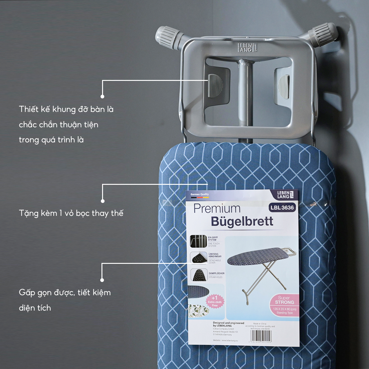 Cầu là ủi quần áo khung thép dạng đứng Lebenlang LBB363 thương hiệu Đức (2 vỏ bọc) - Zalo 0986588655