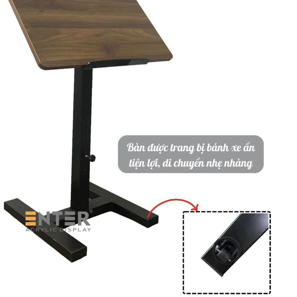 Bàn di động Enter BG107 với thiết kế đơn giản cùng tone màu sắc đẹp mắt. Mặt bàn rộng rãi lên đến 60x40cm mang lại không gian làm việc, học tập, giải trí,... thoải mái và tiện nghi. Mặt bàn ngang đủ rộng cho phép đặt laptop, sách vở, hay các đồ dùng cần thiết khác khi sử dụng mà không gặp bất kỳ hạn chế nào. Ngoài ra, mặt bàn còn được thiết kế điều chình xoay 360 độ, kết hợp cùng chân bàn có khả năng điều chỉnh chiều cao tối thiểu từ 70cm và tối đa đến 120cm hoàn toàn thích hợp với nhiều không gian và mục đích sử dụng như làm bục phát biểu, làm bàn học, bàn ăn, bàn làm việc,...