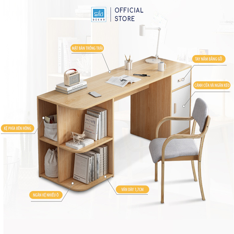 - Tên sản phẩm: Bàn làm việc kèm ngăn kéo và kệ để đồ - Chất liệu: Gỗ MDF phủ melamine cao cấp chống xước - chân bàn gỗ tự nhiên - Màu sắc: Vân gỗ sồi - Kích thước: 80/120 x 55 x 82cm (dài x rộng x cao) - Công năng: Là mẫu bàn làm việc, bàn học giúp tiết kiệm diện tích không gian phòng