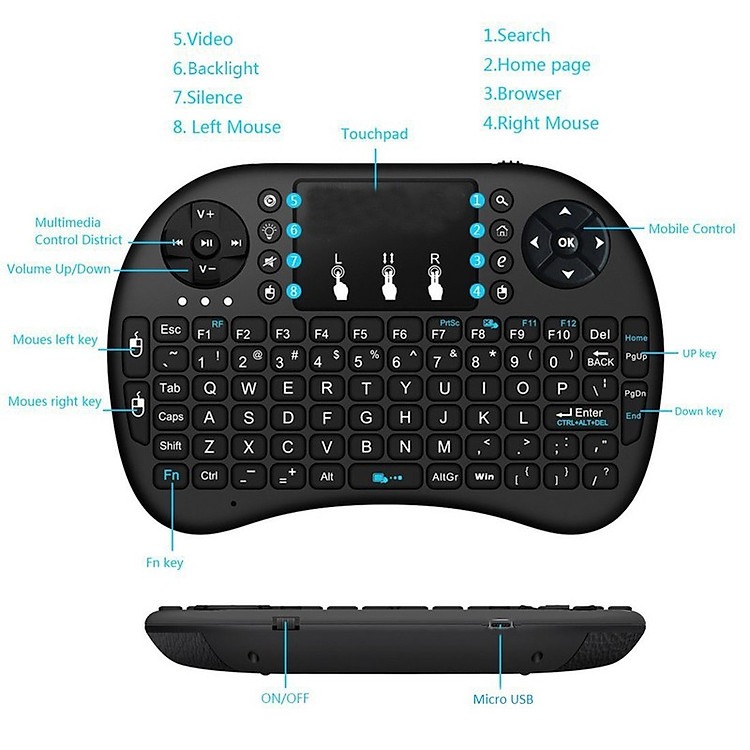 - Bàn phím không dây hỗ trợ các phím, phím tắt, chuột trái, chuột phải và vùng rê chuột như trên bàn phím Laptop.