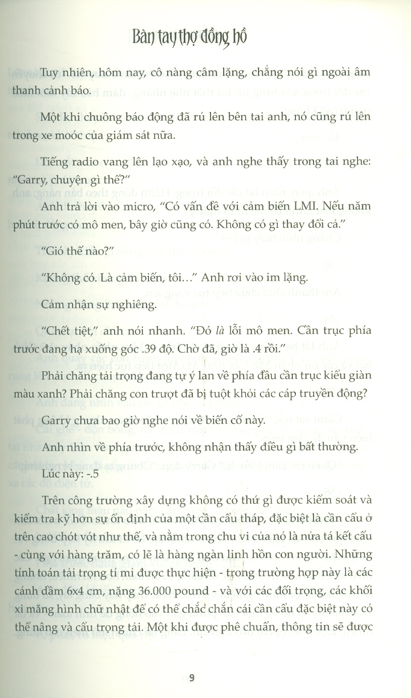 Tiểu thuyết “Bàn tay thợ đồng hồ” của tác giả Jeffery Deaver mở đầu bằng vụ việc, khi một cần cẩu bị sập một cách bí ẩn ở thành phố New York đông đúc náo nhiệt, gây ra tình trạng đổ nát và thương tích cho người dân vô tội. Sau vụ việc đó, một tổ chức chính trị đã đứng ra nhận trách nhiệm và loan báo trên tivi rằng sẽ gây ra một vụ sập cần cẩu thứ hai sau 24 tiếng nữa nếu chính quyền thành phố không đáp ứng cho nhu cầu của chúng.