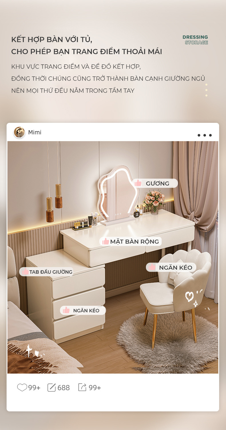 Công năng: Là mẫu bàn trang điểm có thiết kế hiện đại và thông minh, với khả năng có thể thay đổi chiều dài và tùy biến công năng giúp chị em có góc trang điểm đẹp và tiện dụng