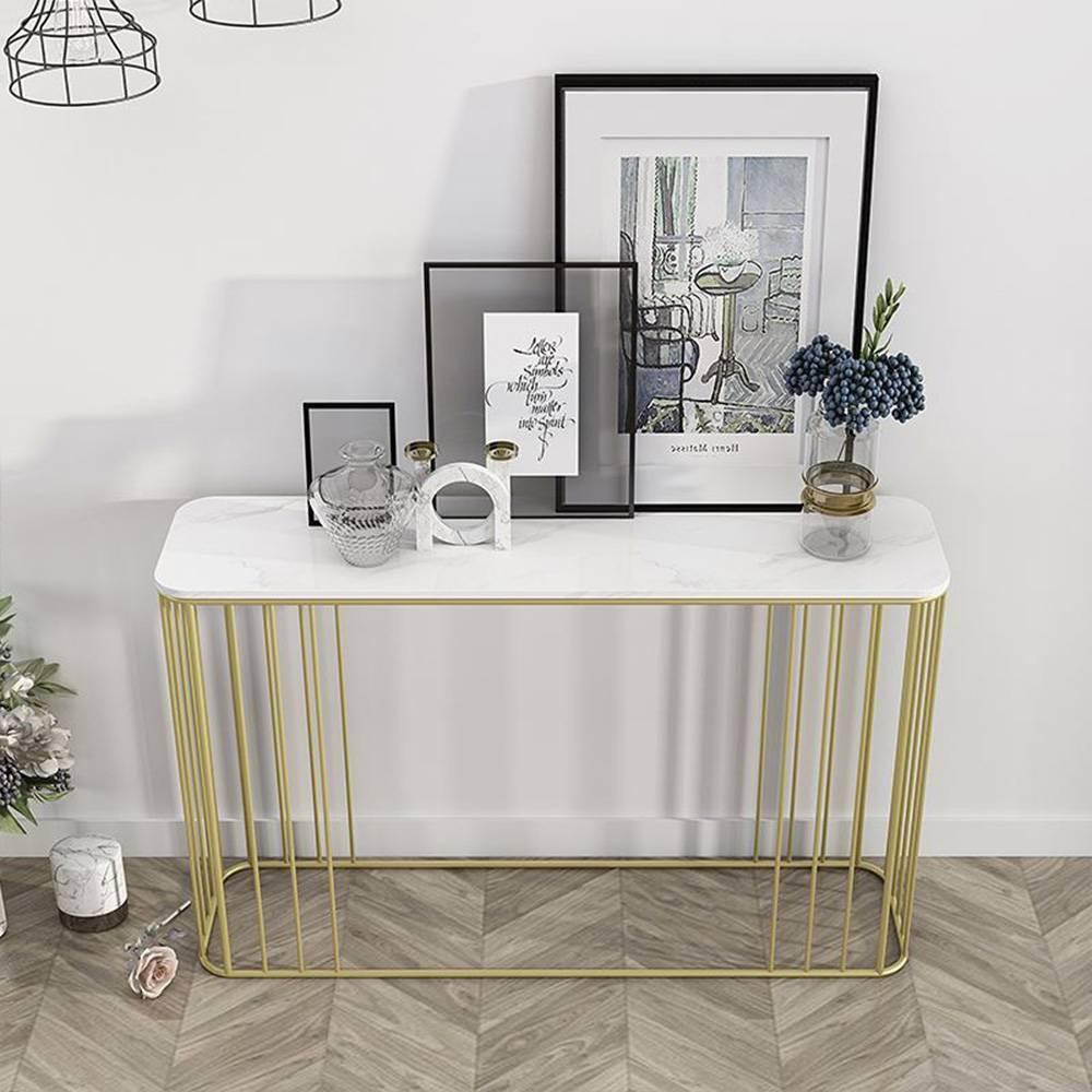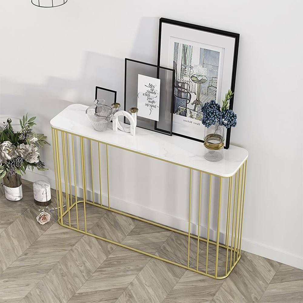 Bàn console, bàn trang trí mặt đá trắng khung sơn vàng CSTCT019 với điểm nhấn khung sắt sơn màu vàng kết hợp mặt đá trắng vân tạo toát lên vẻ đẹp sang trọng giúp nâng tầm giá
