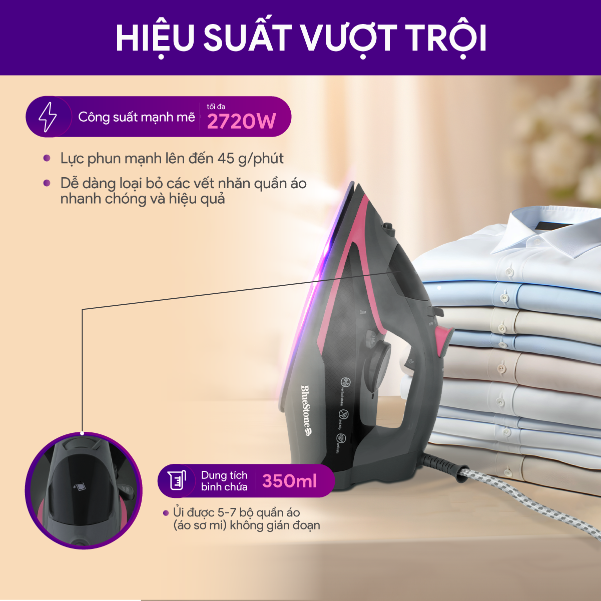 - Công suất: 2290W - 2720W mạnh mẽ, giúp ủi thẳng quần áo nhanh chóng, hiệu quả