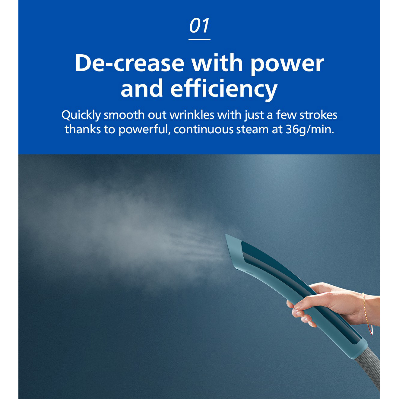- Bảng điều khiển nút xoay tích hợp 3 chế độ phun hơi với lượng hơi nước liên tục đến 36 g/phút, tùy chỉnh dễ dàng phù hợp với chất liệu từng loại vải. Sử dụng chế độ hơi phun thấp cho loại vải mỏng và hơi phun mạnh hơn cho vải dày và áo khoác.