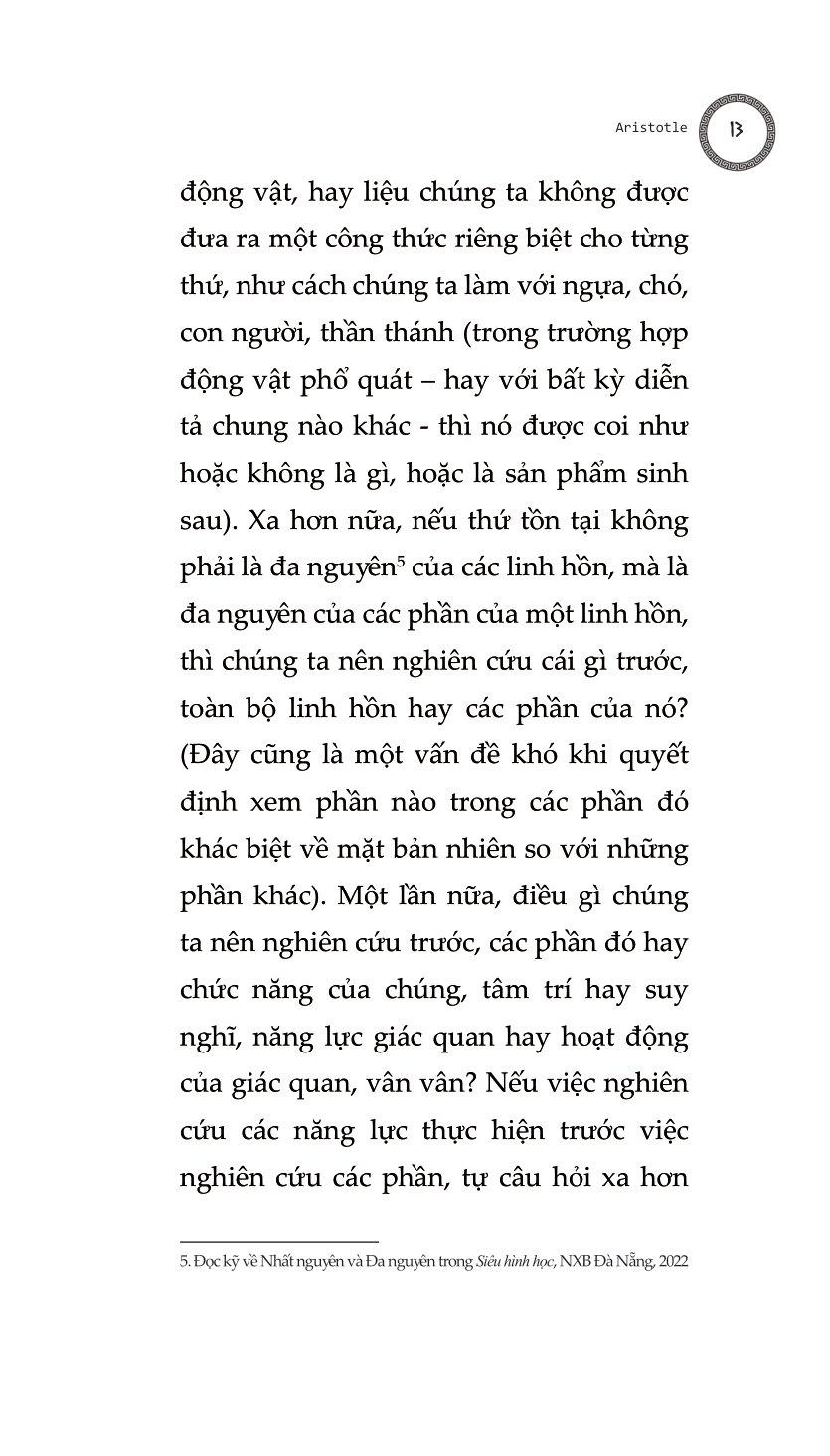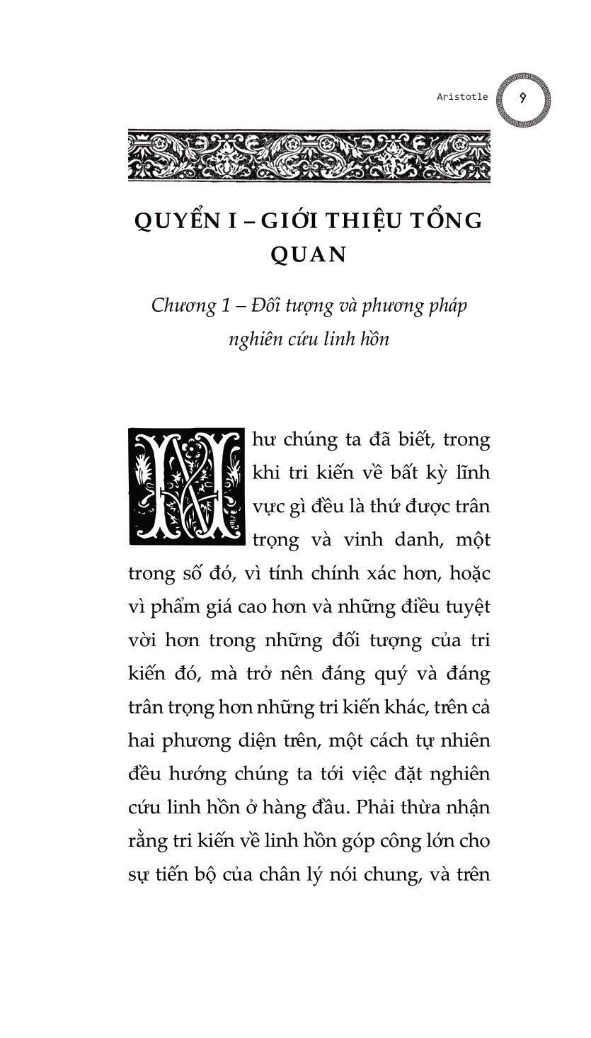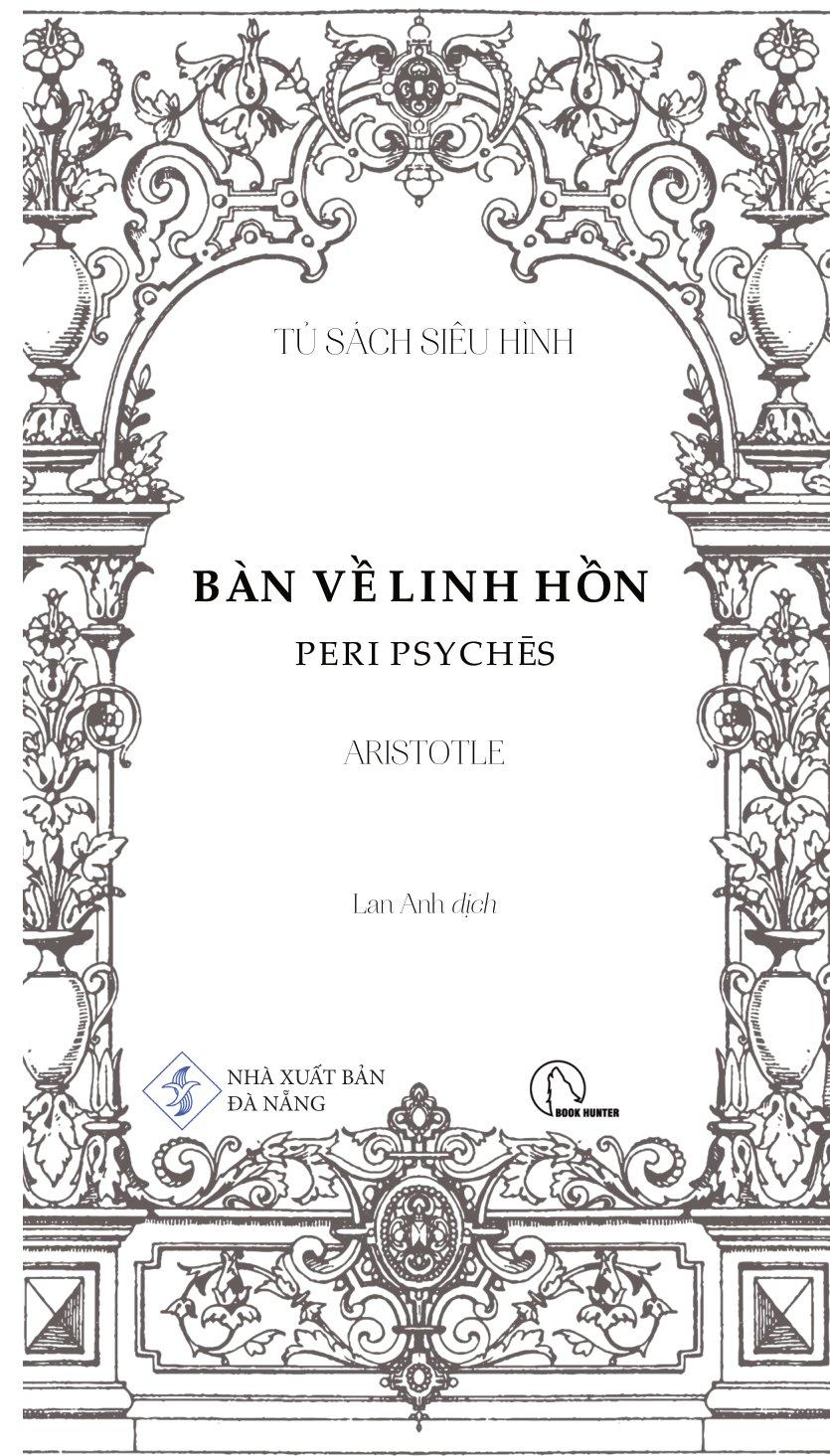 Bàn Về Linh Hồn - Peri Psychēs - Tác Phẩm Triết Học Kinh Điển “Bàn Về Linh Hồn” của Aristotle luận giải sự quan hệ mật thiết giữa linh hồn và cơ thể, trái với quan niệm cho rằng linh hồn tách bạch với cơ thể hay linh hồn điều khiển cơ thể. Aristotle cho rằng linh hồn và vật chất có mối quan hệ tương quan với nhau, hay có thể nói là linh hồn sao thì vật chất vậy và ngược lại. Aristotle thực hiện một sự phân loại các khía cạnh biểu hiện khác nhau của linh hồn bao gồm các giác quan, tâm trí, ý niệm, trí tuệ… và cách linh hồn tương tác với cuộc sống. Chúng ta cũng phải cân nhắc tới việc liệu linh hồn có thể phân chia được, hay không thể chia tách thành các phần, và liệu nó có đồng nhất ở mọi nơi hay không, và nếu không đồng nhất, thì liệu các dạng thức của nó sẽ khác nhau một cách cụ thể, hay khác nhau ở dạng nguyên thể: cho tới nay những người đã và đang thảo luận và nghiên cứu linh hồn dường như giới hạn bản thân họ trong khuôn khổ linh hồn con người. Chúng ta phải cẩn thận để không bỏ qua câu hỏi liệu linh hồn có thể được định nghĩa trong một công thức duy nhất rõ ràng, như trường hợp của động vật, hay liệu chúng ta không được đưa ra một công thức riêng biệt cho từng thứ, như cách chúng ta làm với ngựa, chó, con người, thần thá Quyển I, chương 1 Trước tiên chúng ta phải xem xét tới dinh dưỡng và sinh sản, vì linh hồn nuôi dưỡng (dưỡng hồn) được tìm thấy cùng với tất cả các dạng linh hồn khác và là năng lực khởi nguồn nhất của linh hồn được phân bố rộng rãi, thực tế cái gì có nó đều được nói là có sự sống. Dưỡng hồn tự bộc lộ qua các hoạt động sinh sản và sử dụng thức ăn - sinh sản, tôi nhắc đến, bởi bất kỳ sinh vật sống nào khi đạt đến ngưỡng tăng trưởng bình thường của nó mà không bị tổn hại, và những sinh vật mà cách thức sinh sản của chúng không phải là tự phát, hành động tự nhiên nhất là tạo ra một sinh vật giống chính nó, động vật tạo ra động vật, thực vật tạo ra thực vật, theo cách đó, chừng nào bản nhiên của nó cho phép, nó có thể trở nên bất diệt và linh thiêng. Đó là mục tiêu mà tất cả mọi thứ đấu tranh để giành lấy, vì bất kỳ mục đích gì chúng làm mà bản nhiên của chúng có thể thực hiện. Quyển II, chương 4