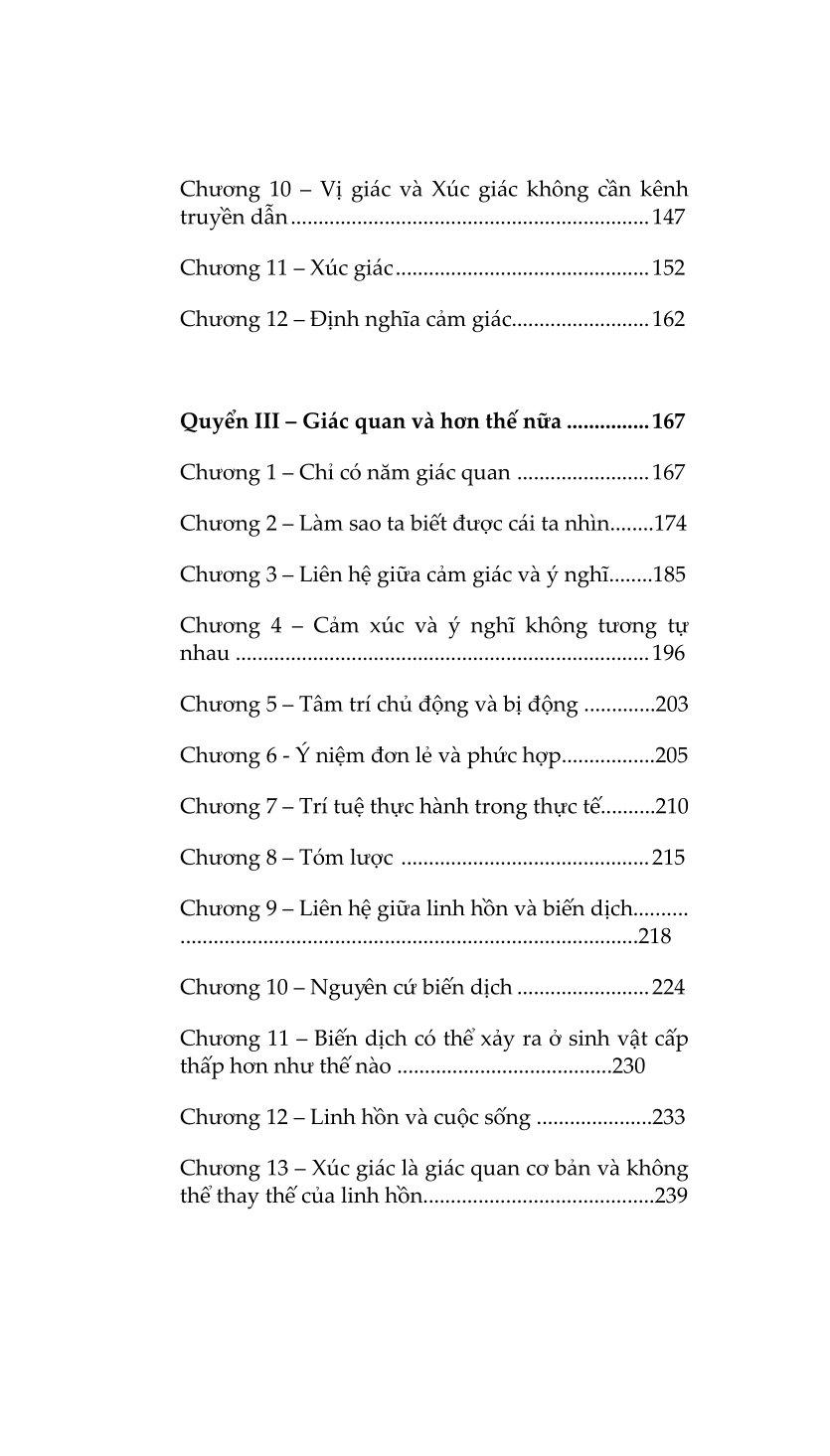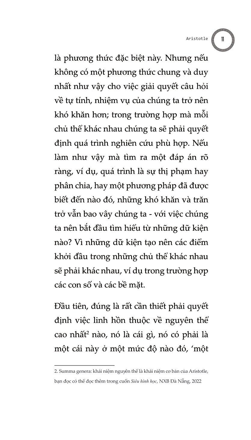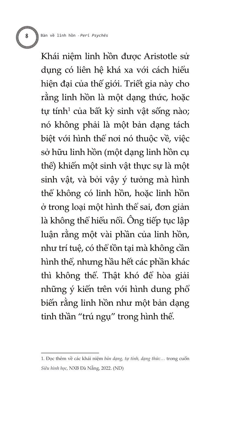 Bàn Về Linh Hồn - Peri Psychēs - Tác Phẩm Triết Học Kinh Điển “Bàn Về Linh Hồn” của Aristotle luận giải sự quan hệ mật thiết giữa linh hồn và cơ thể, trái với quan niệm cho rằng linh hồn tách bạch với cơ thể hay linh hồn điều khiển cơ thể. Aristotle cho rằng linh hồn và vật chất có mối quan hệ tương quan với nhau, hay có thể nói là linh hồn sao thì vật chất vậy và ngược lại. Aristotle thực hiện một sự phân loại các khía cạnh biểu hiện khác nhau của linh hồn bao gồm các giác quan, tâm trí, ý niệm, trí tuệ… và cách linh hồn tương tác với cuộc sống. Chúng ta cũng phải cân nhắc tới việc liệu linh hồn có thể phân chia được, hay không thể chia tách thành các phần, và liệu nó có đồng nhất ở mọi nơi hay không, và nếu không đồng nhất, thì liệu các dạng thức của nó sẽ khác nhau một cách cụ thể, hay khác nhau ở dạng nguyên thể: cho tới nay những người đã và đang thảo luận và nghiên cứu linh hồn dường như giới hạn bản thân họ trong khuôn khổ linh hồn con người. Chúng ta phải cẩn thận để không bỏ qua câu hỏi liệu linh hồn có thể được định nghĩa trong một công thức duy nhất rõ ràng, như trường hợp của động vật, hay liệu chúng ta không được đưa ra một công thức riêng biệt cho từng thứ, như cách chúng ta làm với ngựa, chó, con người, thần thá Quyển I, chương 1 Trước tiên chúng ta phải xem xét tới dinh dưỡng và sinh sản, vì linh hồn nuôi dưỡng (dưỡng hồn) được tìm thấy cùng với tất cả các dạng linh hồn khác và là năng lực khởi nguồn nhất của linh hồn được phân bố rộng rãi, thực tế cái gì có nó đều được nói là có sự sống. Dưỡng hồn tự bộc lộ qua các hoạt động sinh sản và sử dụng thức ăn - sinh sản, tôi nhắc đến, bởi bất kỳ sinh vật sống nào khi đạt đến ngưỡng tăng trưởng bình thường của nó mà không bị tổn hại, và những sinh vật mà cách thức sinh sản của chúng không phải là tự phát, hành động tự nhiên nhất là tạo ra một sinh vật giống chính nó, động vật tạo ra động vật, thực vật tạo ra thực vật, theo cách đó, chừng nào bản nhiên của nó cho phép, nó có thể trở nên bất diệt và linh thiêng. Đó là mục tiêu mà tất cả mọi thứ đấu tranh để giành lấy, vì bất kỳ mục đích gì chúng làm mà bản nhiên của chúng có thể thực hiện. Quyển II, chương 4