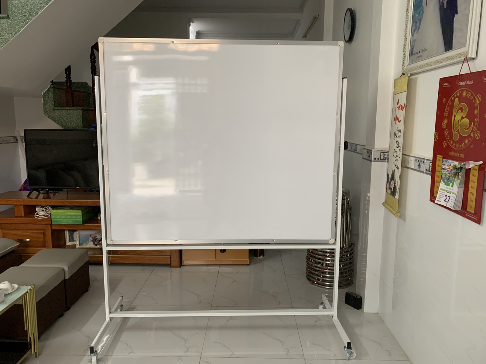 Bảng di động 2 mặt từ Hàn Quốc trắng - xanh là dòng bảng có chân, có gắn bánh xe Taiwan di chuyển hoặc cố định dễ dàng Mặt bảng xoay và sử dụng được
