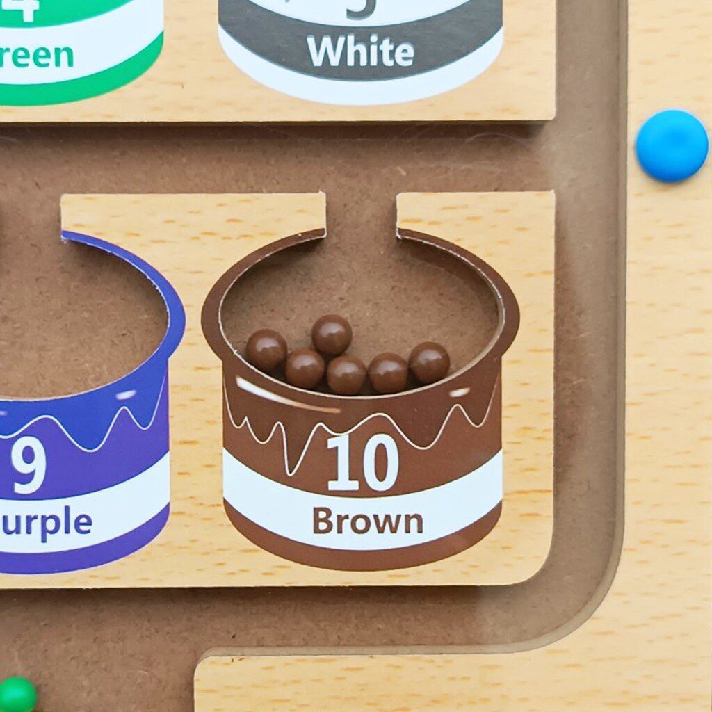 - Chưa hết, đây cũng sẽ là công cụ hữu hiệu để trẻ học đếm vì trên từng hũ sẽ có đánh số thứ tự tương ứng với số viên bi cần phải di chuyển. Việc làm quen với màu sắc và số đếm trở nên thú vị hơn bao giờ hết.