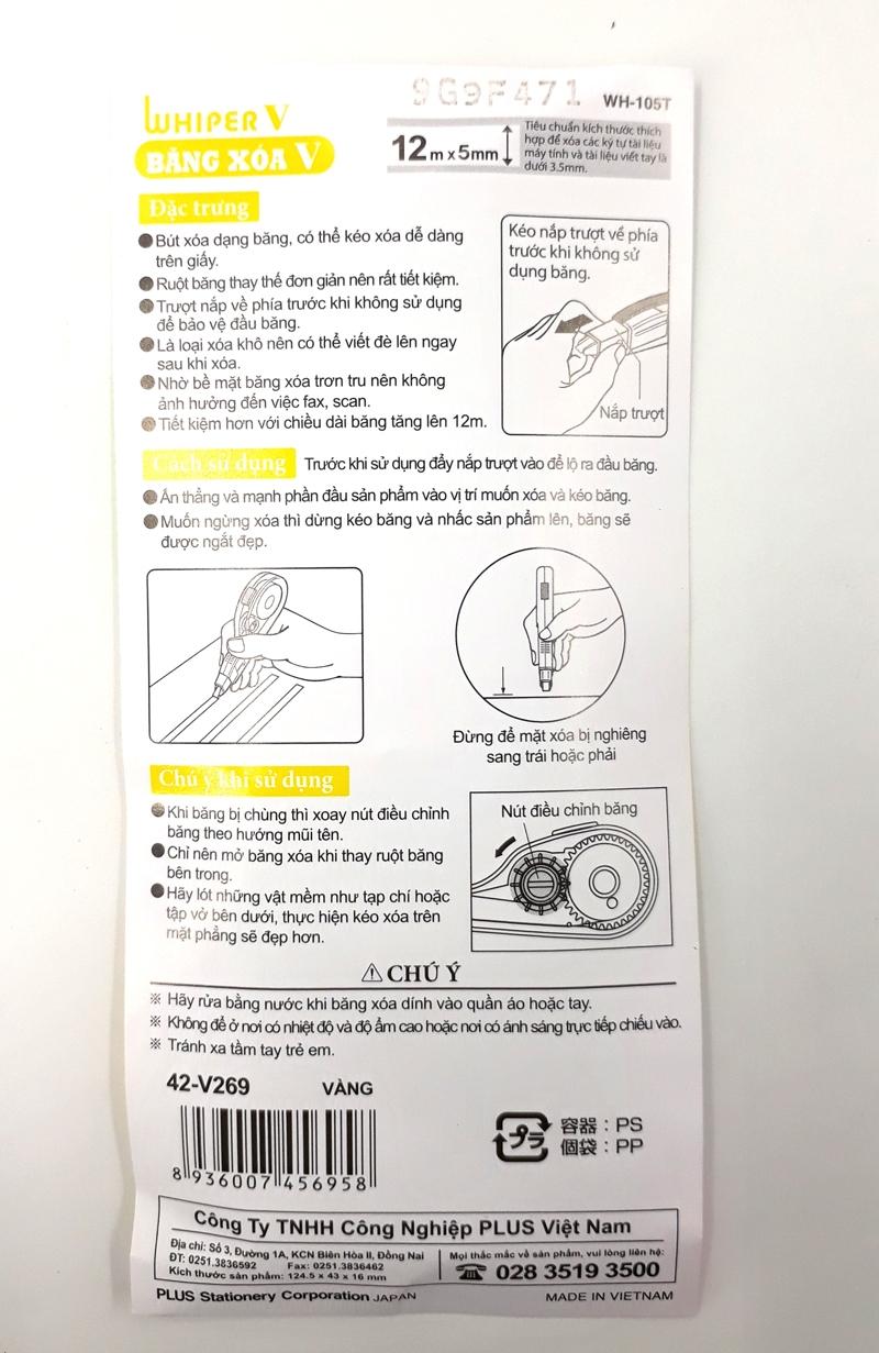 - Băng Xóa Plus V- 42-V269 - Vàng với thiết kế thông minh với đầu xóa nằm ngang giúp lực kéo êm, nhẹ nhàng, dễ dàng sử dụng. - Chiều dài băng xóa lớn và