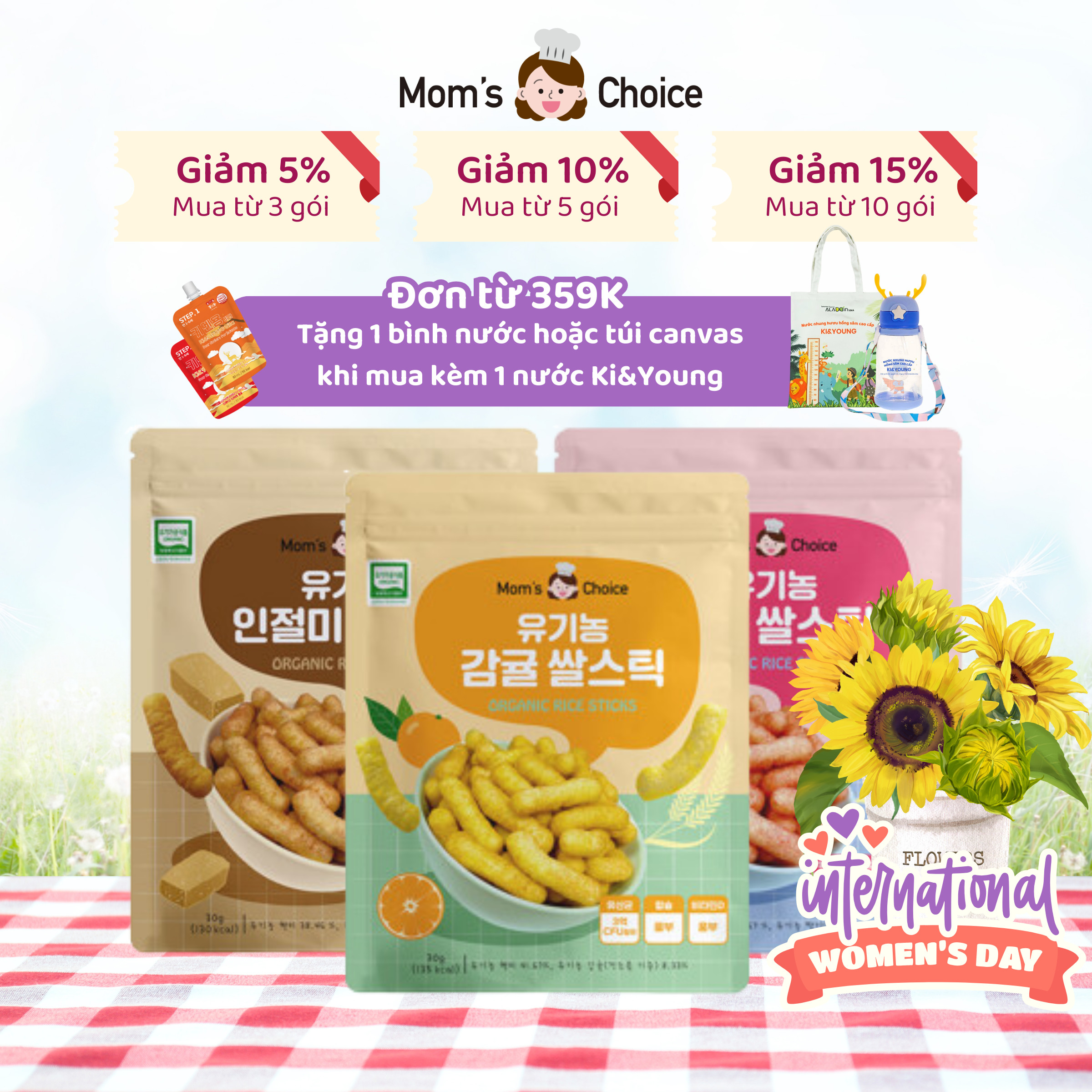 ĐỀN 10 LẦN NẾU PHÁT HIỆN HÀNG KHÔNG PHẢI HÀNG CHÍNH HÃNG. Tên sản phẩm:                       Bánh ăn dặm gạo lứt hữu cơ hình que Moms Choice. Thương hiệu:                         Moms Choice. Xuất xứ:                                Hàn Quốc. Gồm 3 vị:                              Dâu, Quýt, Đậu nành. Trọng lượng:                         30g/gói. Chứng nhận:                         HACCP an toàn thực phẩm. Dành cho:                             Bé từ 6 tháng tuổi. HSD:                                    12 tháng kể từ ngày sản xuất. Chương trình quà tặng đặc biệt cho các sản phẩm bánh ăn dặm. Thời gian diễn ra: 01/05/2024 - Khi hết quà tặng. SỐ LƯỢNG QUÀ TẶNG CÓ GIỚI HẠN. CHƯƠNG TRÌNH CÓ THỂ KẾT THÚC SỚM HƠN DỰ KIẾN Khi mua các sản phẩm ăn dặm có giá trị đơn hàng từ 359.000 đồng trở lên và có kèm từ 01 sản phẩm nước Nhung Hươu Ki&Young sẽ được tặng ngẫu nhiên 01 Bình nước hoặc 01 Túi canvas. Riêng sản phẩm nước Nhung hươu Ki&Young khi mua từ 10 gói sẽ được tặng ngẫu nhiên 01 Bình nước hoặc 01 Túi canvas ĐỀN 10 LẦN NẾU PHÁT HIỆN HÀNG KHÔNG PHẢI HÀNG CHÍNH HÃNG. Đặc điểm nổi bật của bánh ăn dặm gạo lứt hữu cơ hình que Moms Choice: