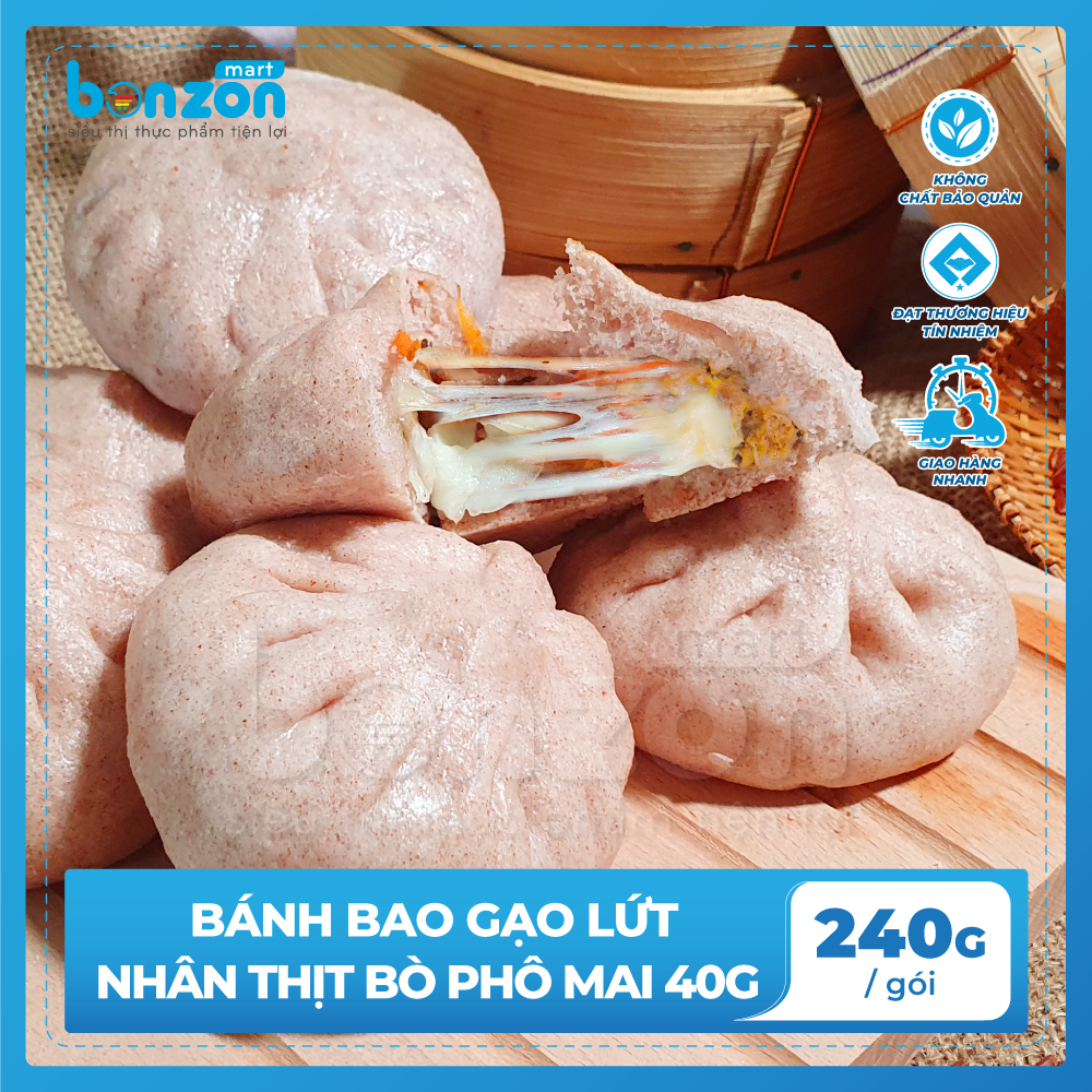 - Món bánh bao gạo lứt nhân thịt bò phô mai thơm ngon, thích hợp làm bữa sáng, bữa xế hoặc bữa ăn nhẹ bổ dưỡng, tiện lợi, phù hợp cho cả gia đình CÁCH CHẾ BIẾN: Không rã đông. Hấp ở 100ºC trong 8-10 phút BẢO QUẢN: Ở nhiệt độ -18°C hoặc trong ngăn đá tủ lạnh. Không đông lại sau khi đã rã đông HSD: 18 tháng