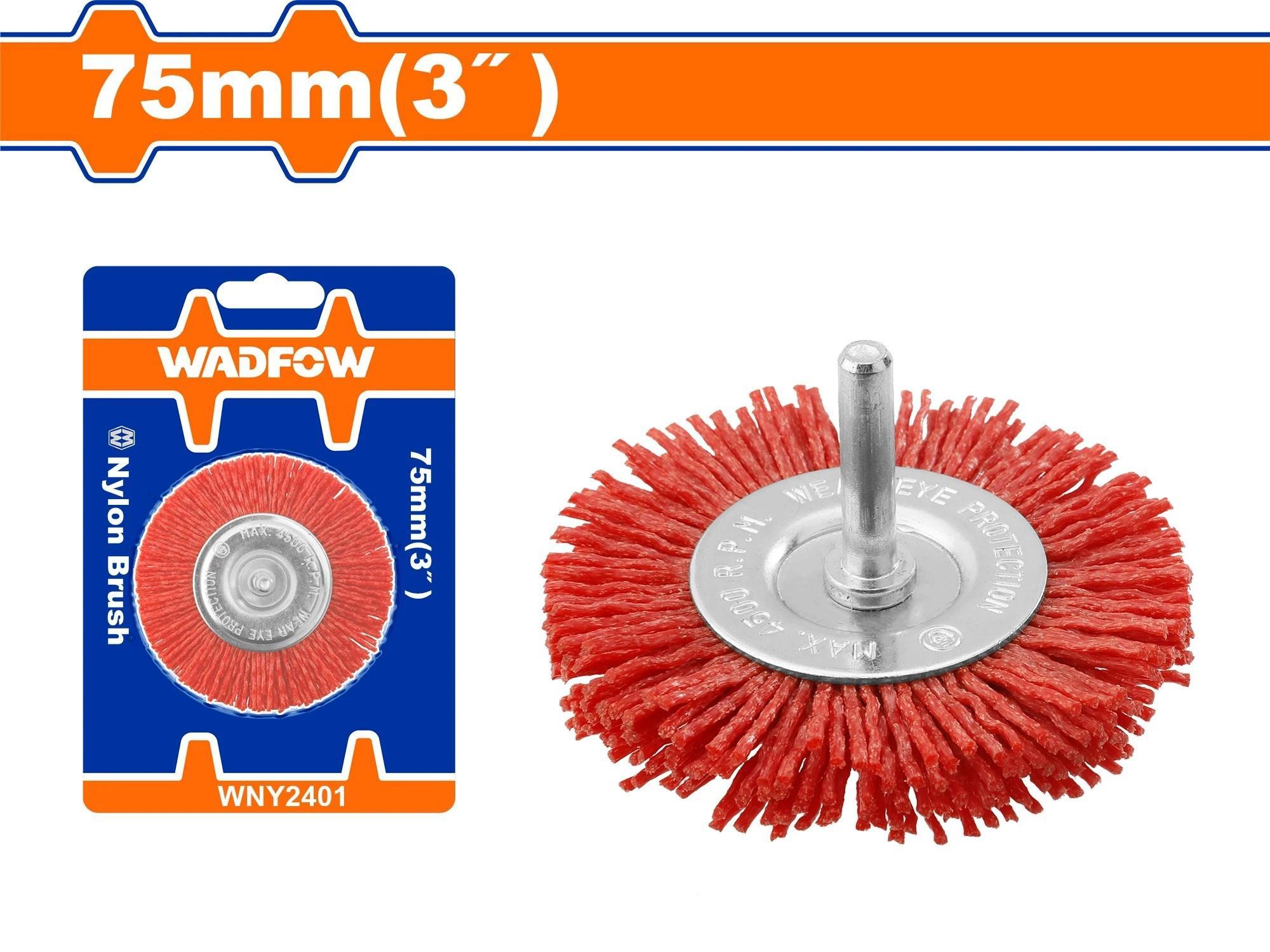 Bánh Cước Nylon 75mm(3") WadFow WNY2401 được sử dụng để làm nhám và tẩy cặn trên nhiều loại vật liệu như thép, thép đúc, thép không gỉ, kim loại màu, nhôm, gỗ mềm và gỗ cứng.
