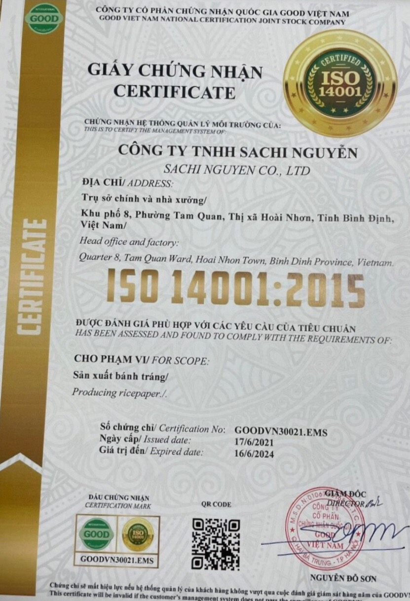 Bánh tráng gạo mè nướng sẵn Sachi xốp, giòn rụm, được sản xuất trên dây chuyền hiện đại khép kín, bánh nướng bằng điện vàng đều 2 mặt, bao bì hút chân không đảm bảo an toàn vệ sinh thực phẩm. Các chứng nhận: Đạt chứng nhận ISO 22000: 2018 Đạt chứng nhận ISO 14001: 2015 Đạt chứng nhận Sản Phẩm Công Nghiệp Nông Thôn Tiêu Biểu Đạt chứng nhận Sản Phẩm OCOP 4 sao Xuất khẩu đến thị trường Mỹ, Canada, Đài Loan,