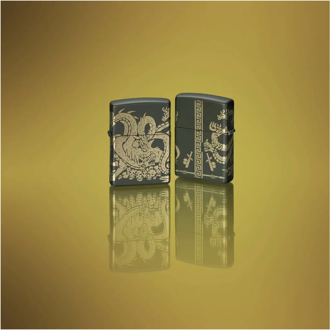 Mẫu Green Matte mạnh mẽ này đánh dấu sự ra mắt của phương pháp khắc Laser 360° sắc nét và chính xác trên các mẫu đế mờ đặc trưng của chúng tôi – một phương pháp xử lý trước đây chỉ dành riêng cho bề mặt trước. Tác phẩm được chỉ huy bởi một con rồng nhiều đầu trên đỉnh tàn tích của những kẻ thách thức nó, được mô tả bằng tông màu đồng sáng bóng. Được đóng gói trong một hộp đựng dạng quà tặng. Để tối ưu hiệu suất, hãy dùng nhiên liệu bật lửa của Zippo.