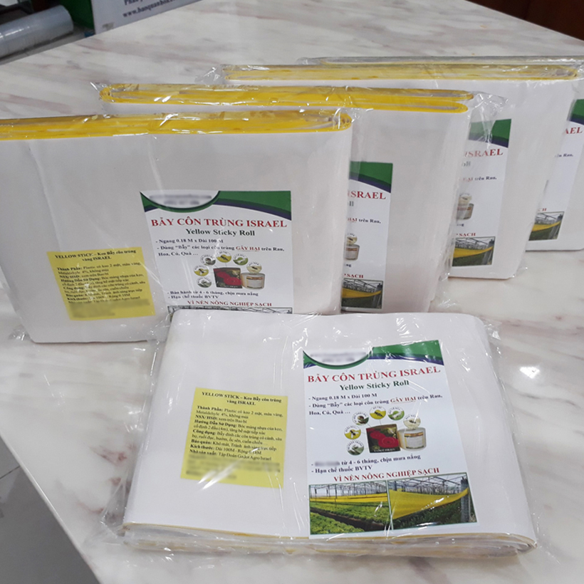 - Kéo Dính Màu Vàng Sinh Học Israel (Sticky Yellow Roll): nguyên cuộn chiều rộng 18 cm x dài 100 mét (lưu ý: 1.000m2 dưa lưới chỉ cần 50 mét bẫy đến 100 mét bẫy)