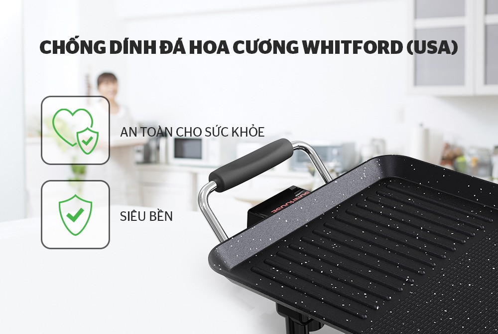 ĐẶC ĐIỂM NỔI BẬT - Cấu tạo bếp nướng thông minh, dễ dàng tháo lắp vệ sinh sau khi sử dụng - Bề mặt phủ chống dính đá hoa cương Whitford – USA siêu bền,