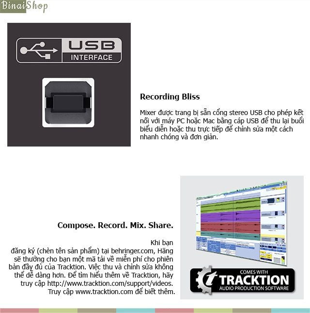 • Mixer thu âm Behringer XENYX được tích hợp giao diện âm thanh nổi USB / Audio để kết nối trực tiếp với máy tính. Đi kèm phần mềm ghi âm, chỉnh sửa và podcasting miễn phí mở rộng 150 công cụ / hiệu ứng plug-ins tại behringer.com