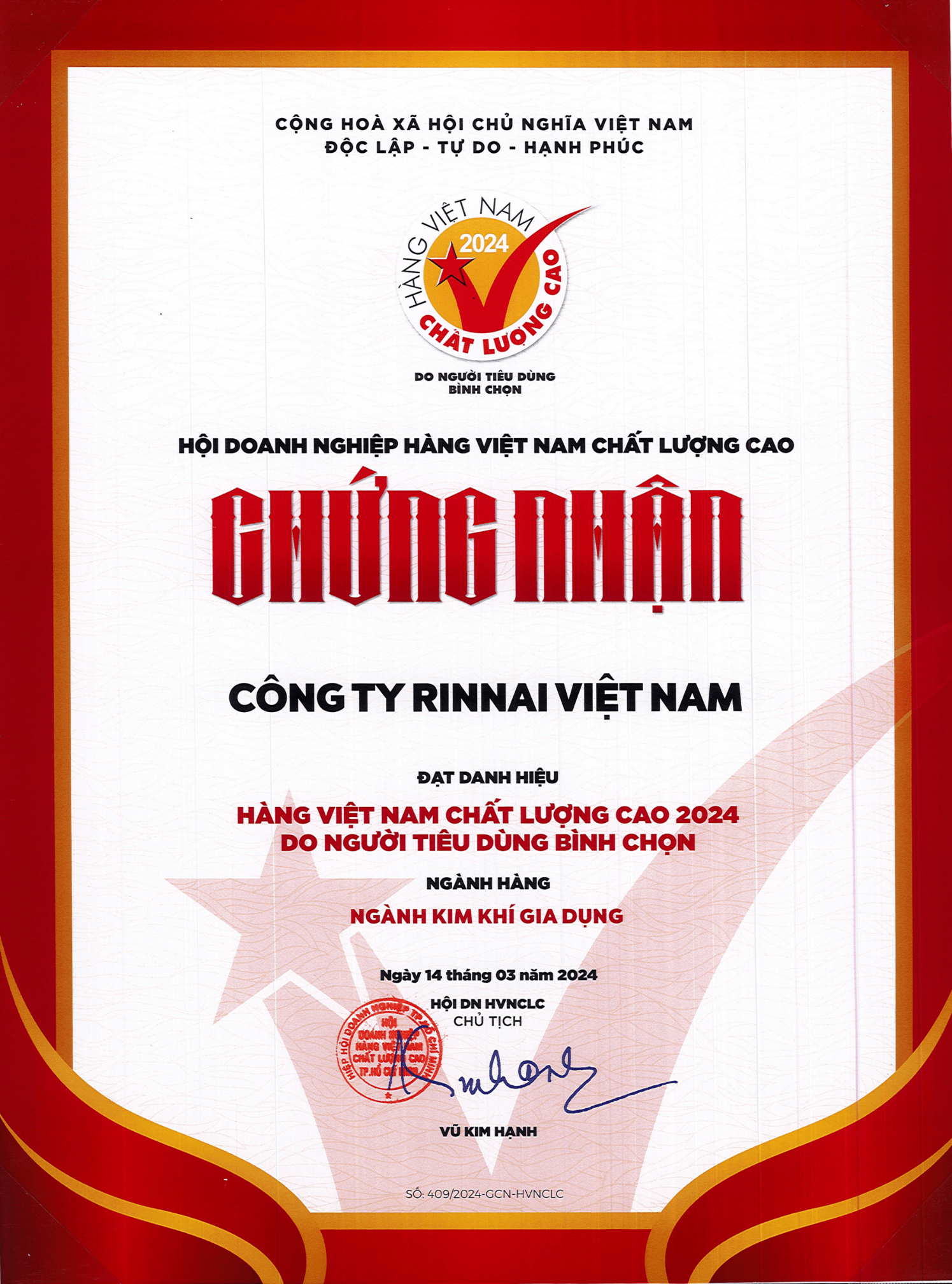 Tập đoàn Rinnai được thành lập vào năm 1950, đến nay đã có hơn 100 năm hình thành và phát triển trong lĩnh vực sản xuất và kinh doanh thiết bị nhiệt năng. Ngoài trụ sở và nhà máy tại Nhật Bản, tập đoàn Rinnai đã có 46 công ty (12 công ty tại Nhật Bản và 34 công ty tại các nước từ Châu Á đến Châu Âu trên thế giới). Tại thị trường Việt Nam vào 14/03/2023, Rinnai Việt Nam một lần nữa nhận được "chứng nhận Hàng Việt Nam chất lượng cao" liên tiếp 23 năm do người tiêu dùng bình chọn.