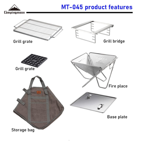 MÔ TẢ SẢN PHẨM BẾP NƯỚNG THAN HOA GẤP GỌN 6-8 NGƯỜI CAMPINGMOON MT-045 * THÔNG TIN SẢN PHẨM: - Thương hiệu: Campingmoon - Mã sản phẩm: MT-045 - Chất liệu: + Lưới nướng: Inox